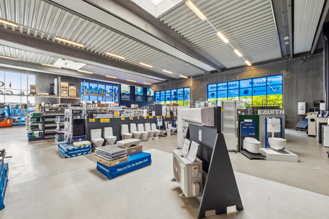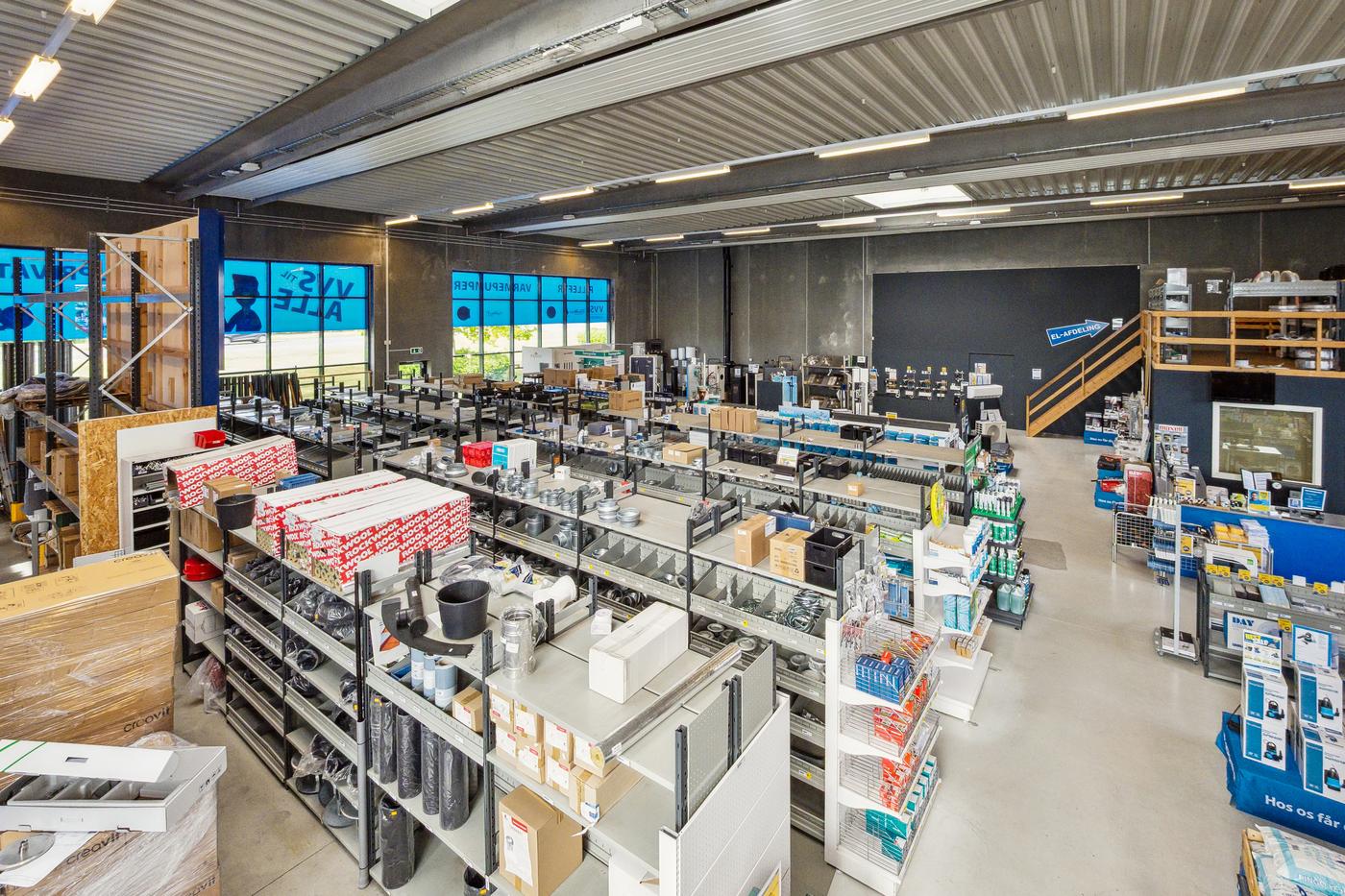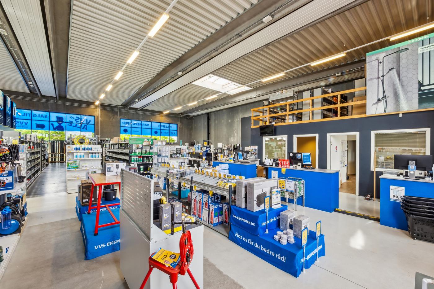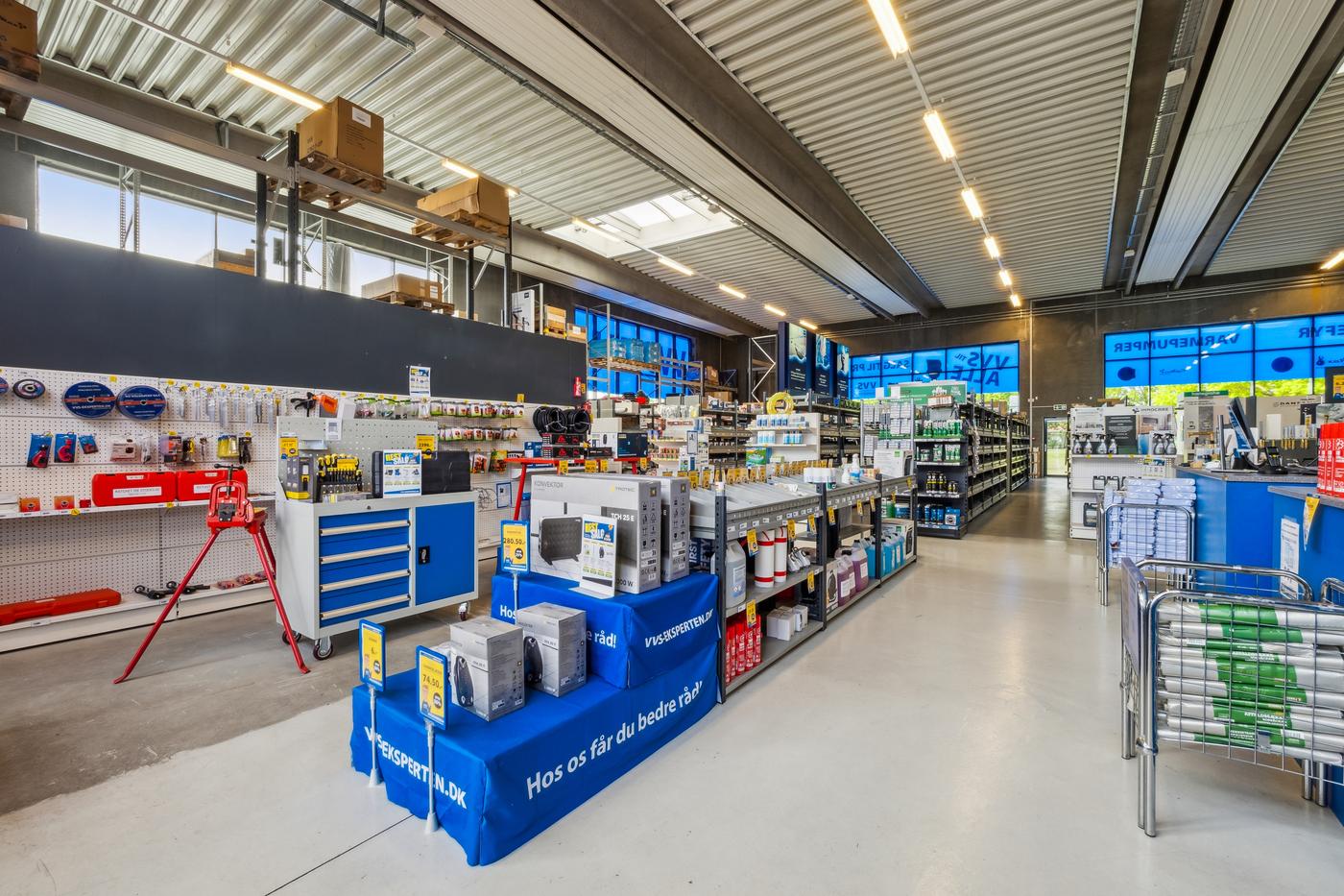 Indretning: indgangsparti med adgang til rektangulært forretningslokale med adgang til mindre kontor- og personaleafsnit med frokostrum, kontor, toilet og teknikrum. Loftshøjde ca. 6 meter under spær. Gulvet er malet betongulv.