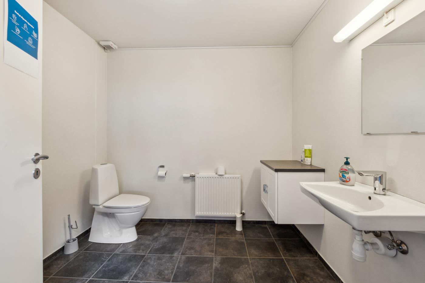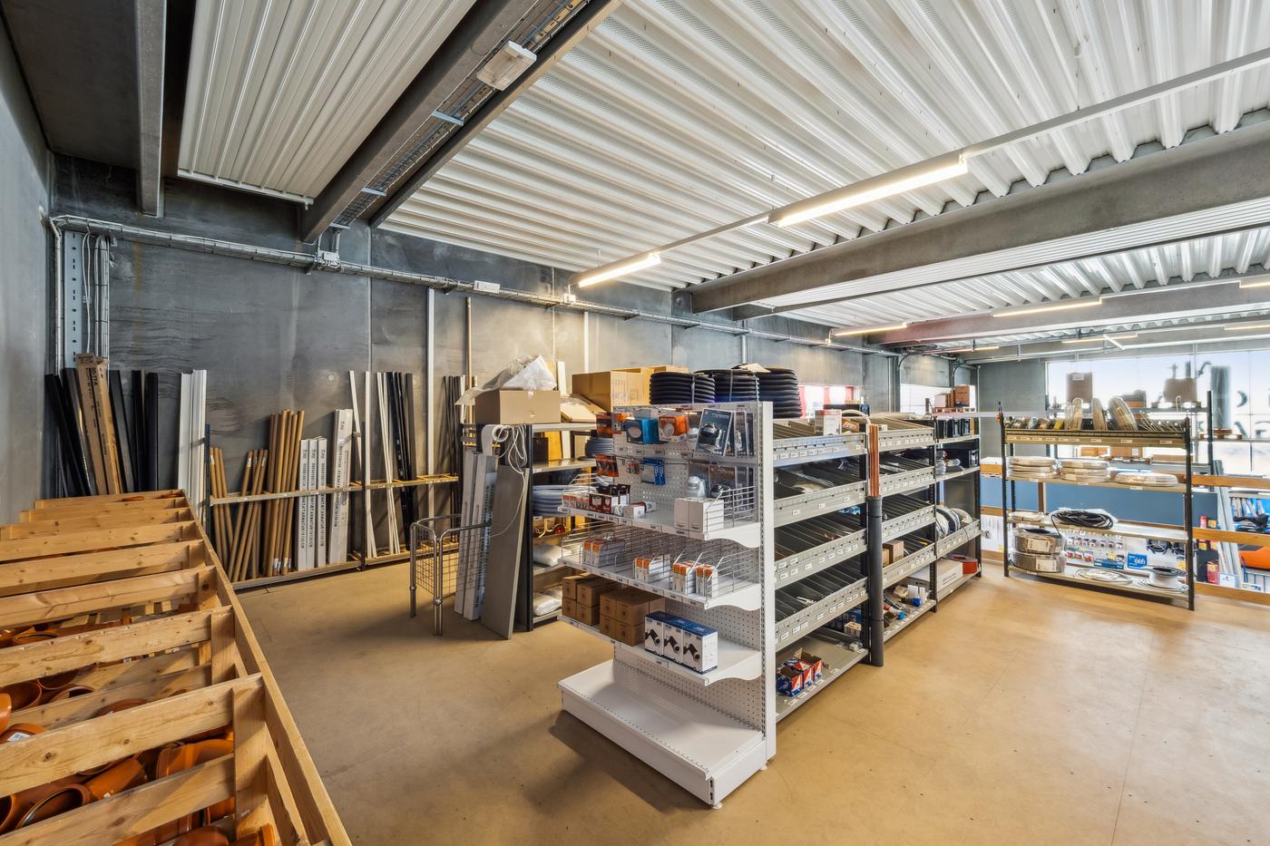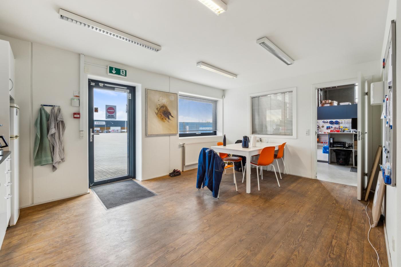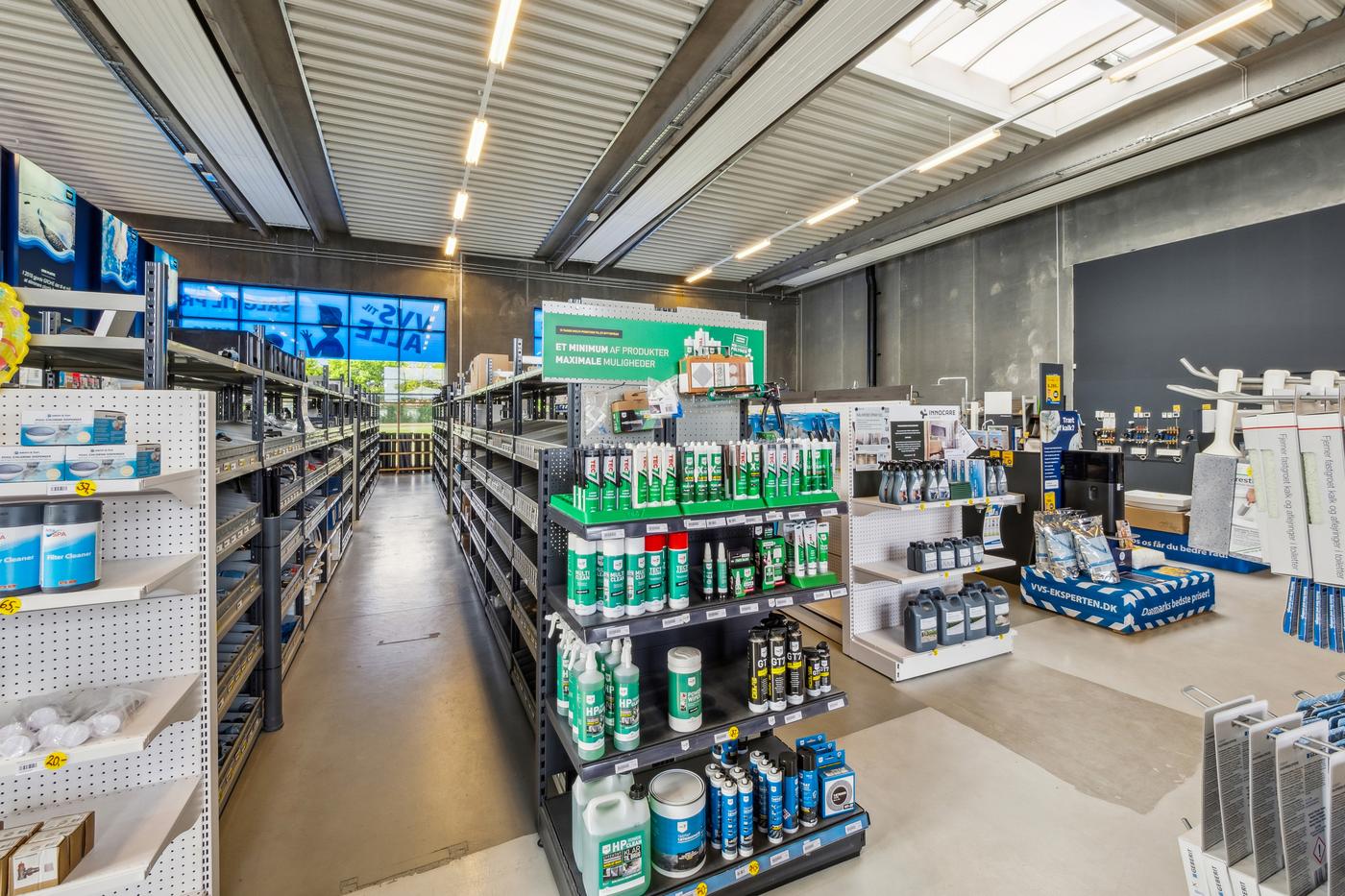 Indretning: indgangsparti med adgang til rektangulært forretningslokale med adgang til mindre kontor- og personaleafsnit med frokostrum, kontor, toilet og teknikrum. Loftshøjde ca. 6 meter under spær. Gulvet er malet betongulv.