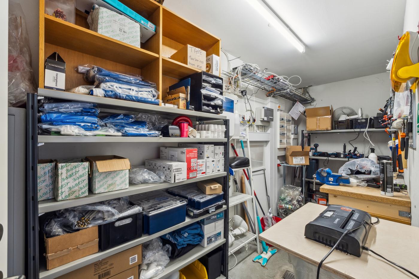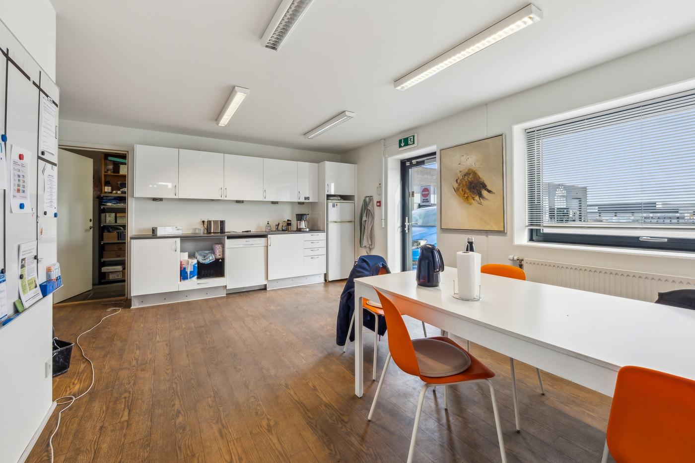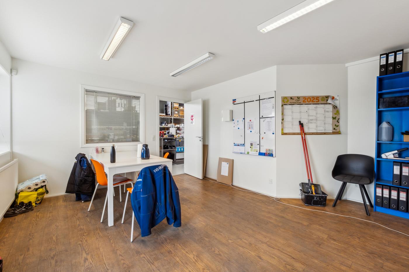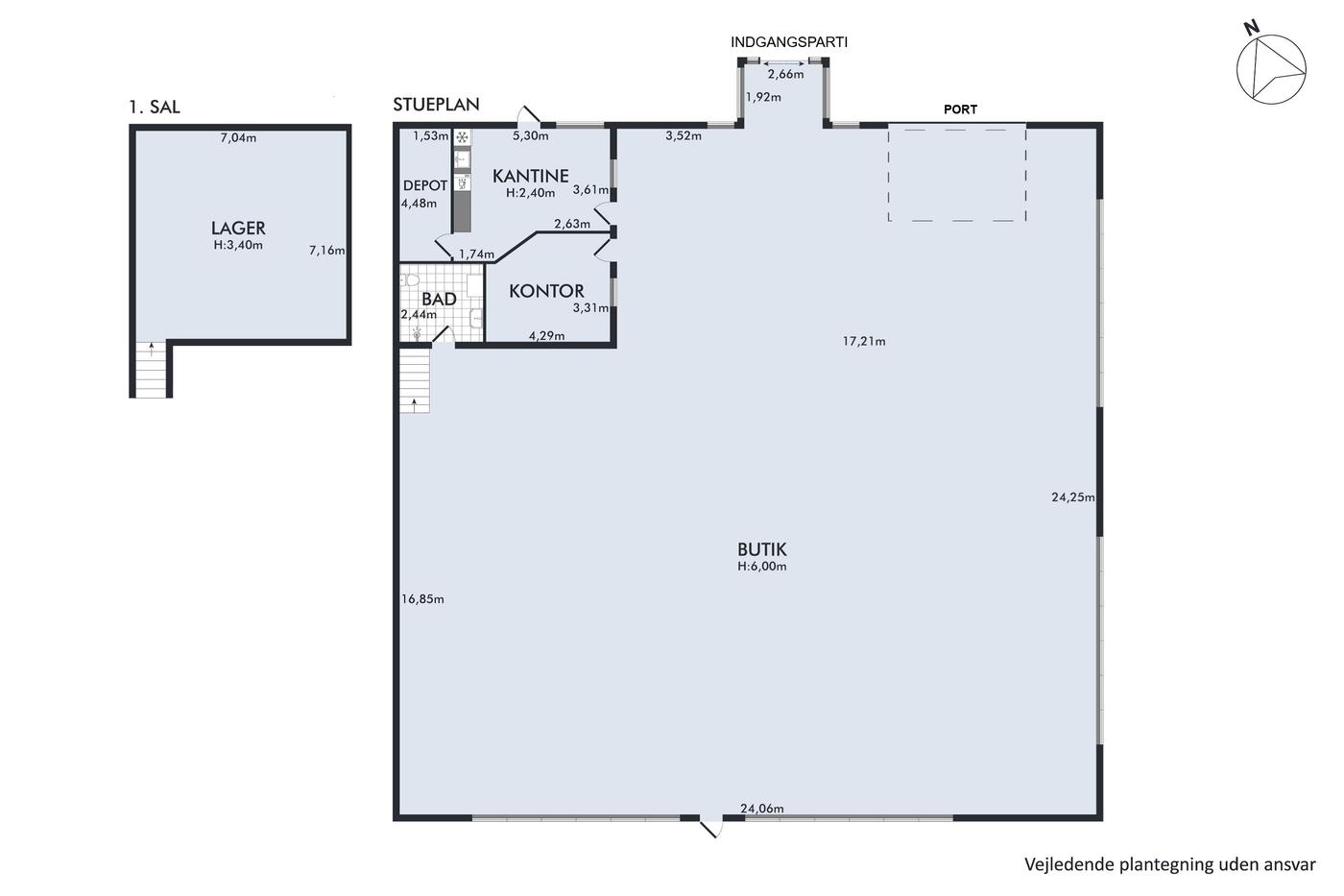 Indretning: indgangsparti med adgang til rektangulært forretningslokale med adgang til mindre kontor- og personaleafsnit med frokostrum, kontor, toilet og teknikrum. Loftshøjde ca. 6 meter under spær. Gulvet er malet betongulv.