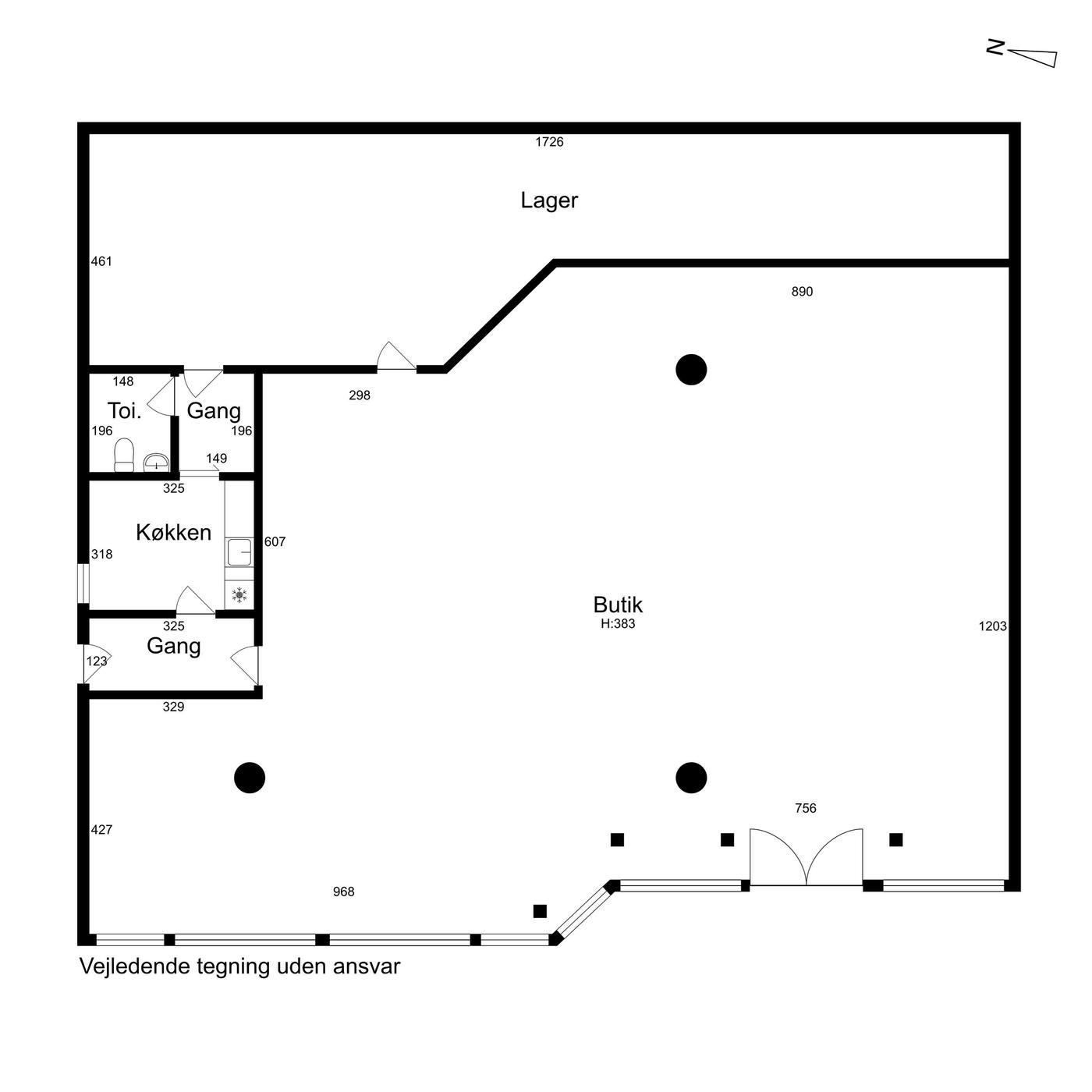 Konstruktion og facader: Højloftet butiks og lagerlokale