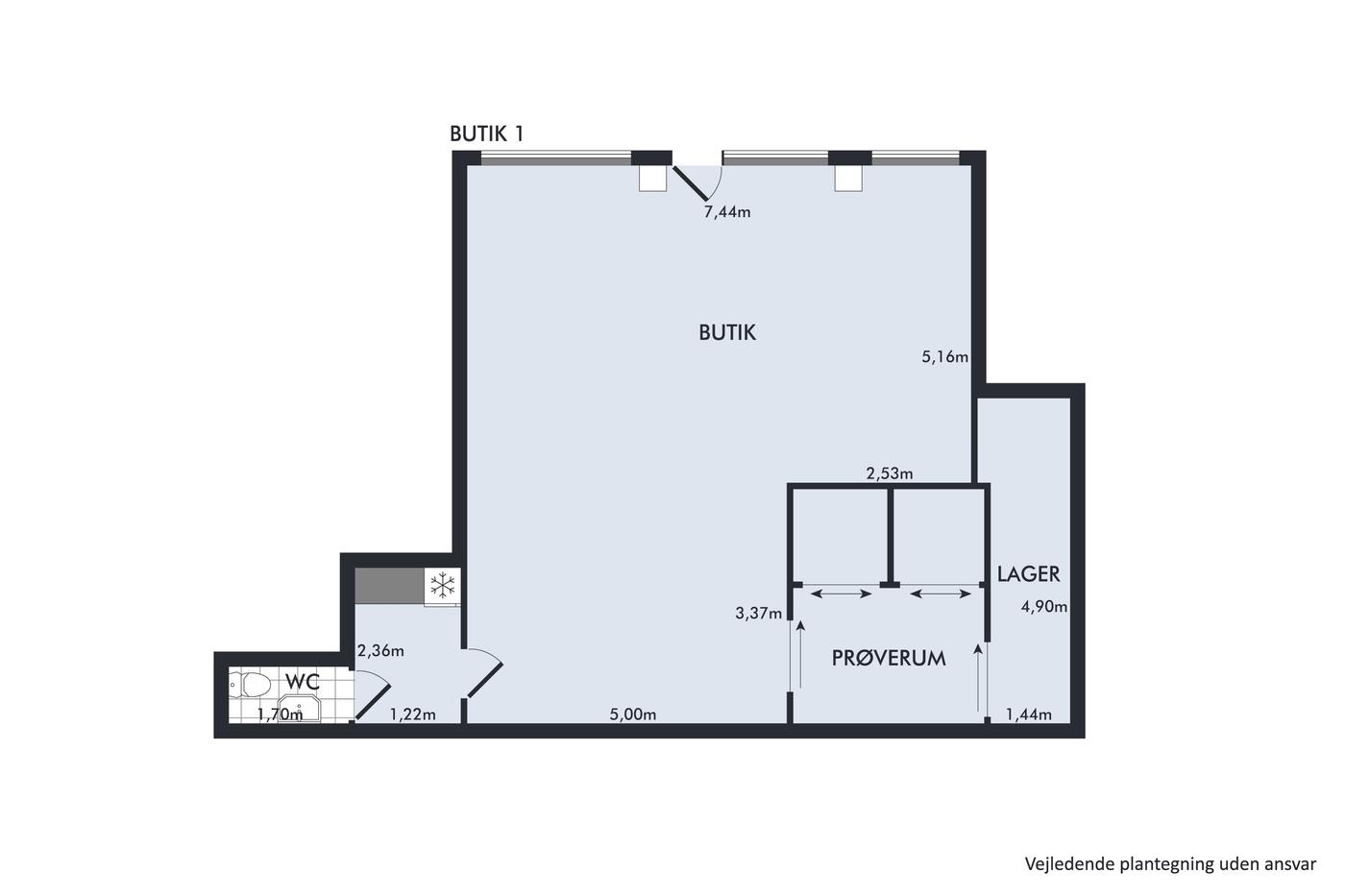 Indretning: Lejemålet består af et regulært butiksareal med prøverum. Fra butikken er der adgang til lagerrum samt toilet.