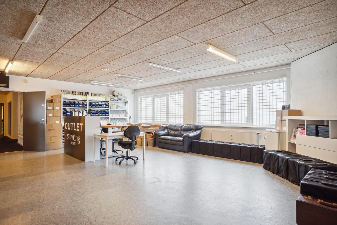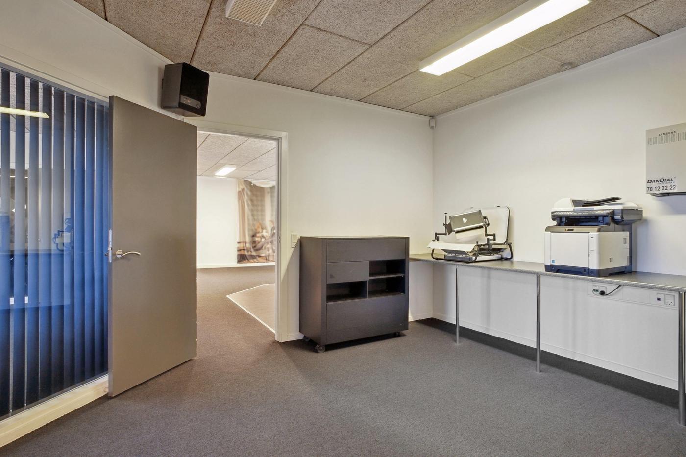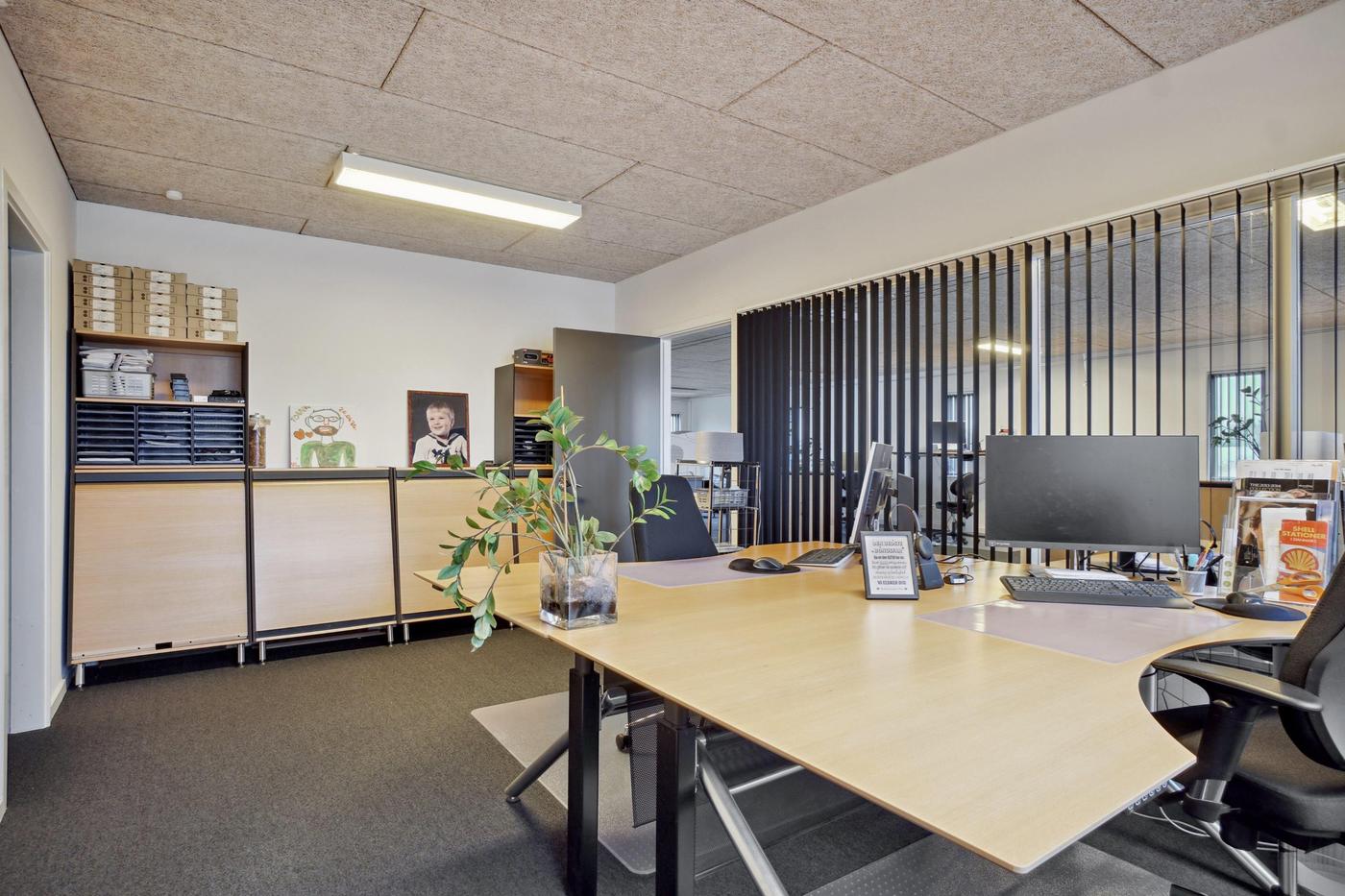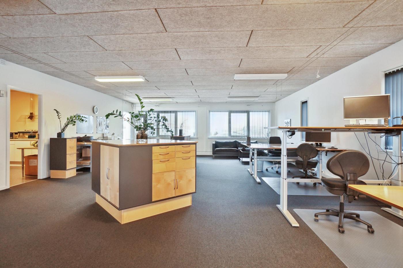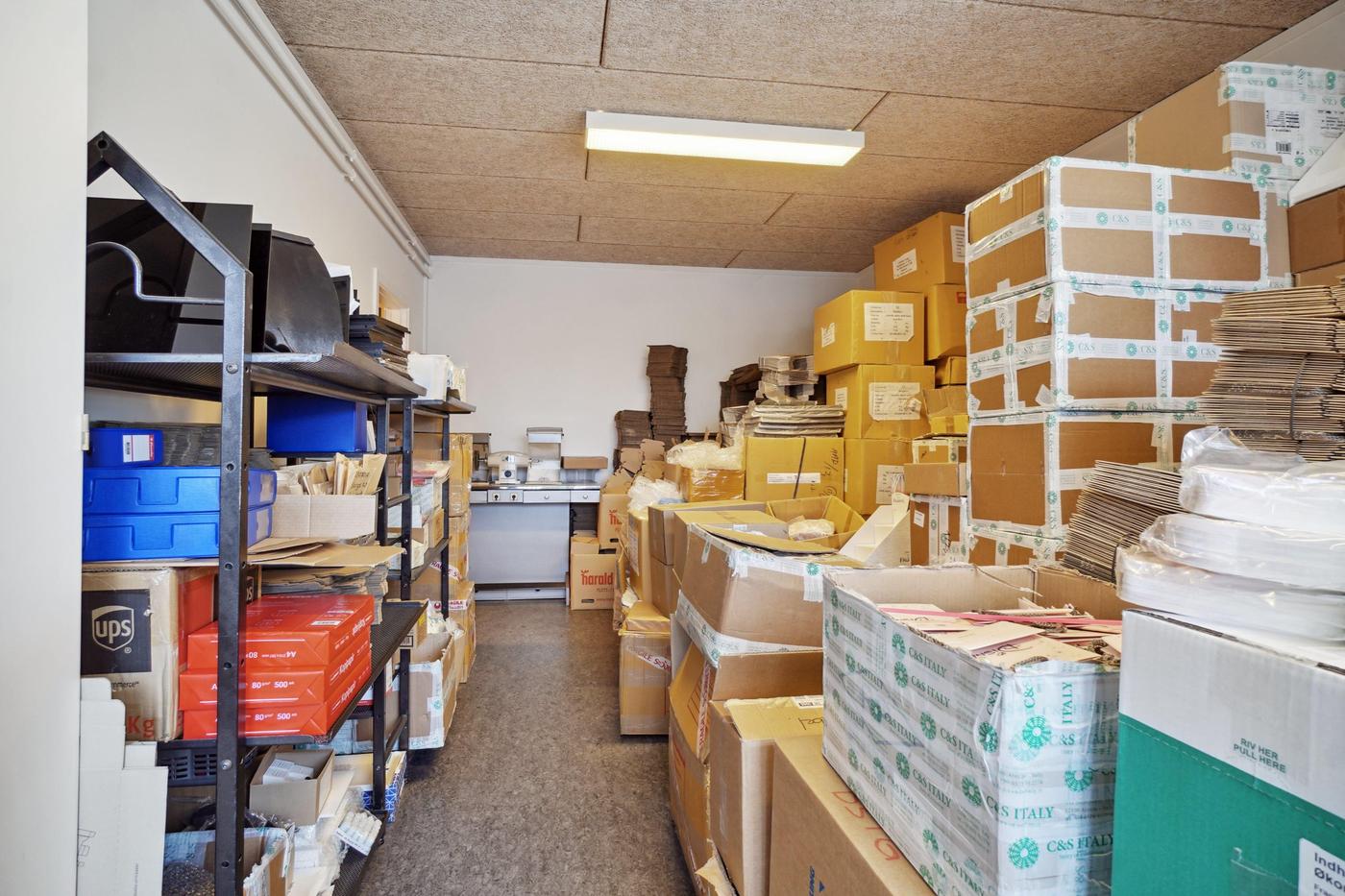 Ejendommen er indrettet med et åbent kontorlandskab på ca. 100 m², 4 kontorer/mødelokaler, samt en fin frokoststue med dertilhørende tekøkken. Fra administrationsdelen er der direkte adgang til lager/showrrom, som har et højt sikringsniveau, da sælger har drevet smykkeforretning fra ejendommen. Lageret er forsynet med troldtektlofter og linoleumsgulve, hvilket giver et behageligt arbejdsmiljø for lagermedarbejderne. Der er gitter for vinduerne i lagerdelen, og adgang udefra via mindre port.