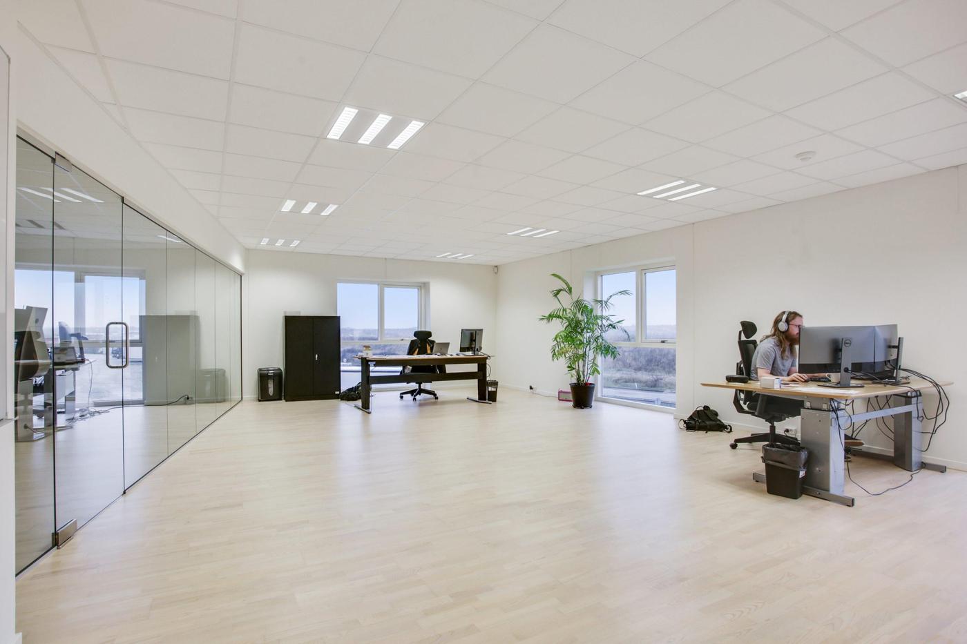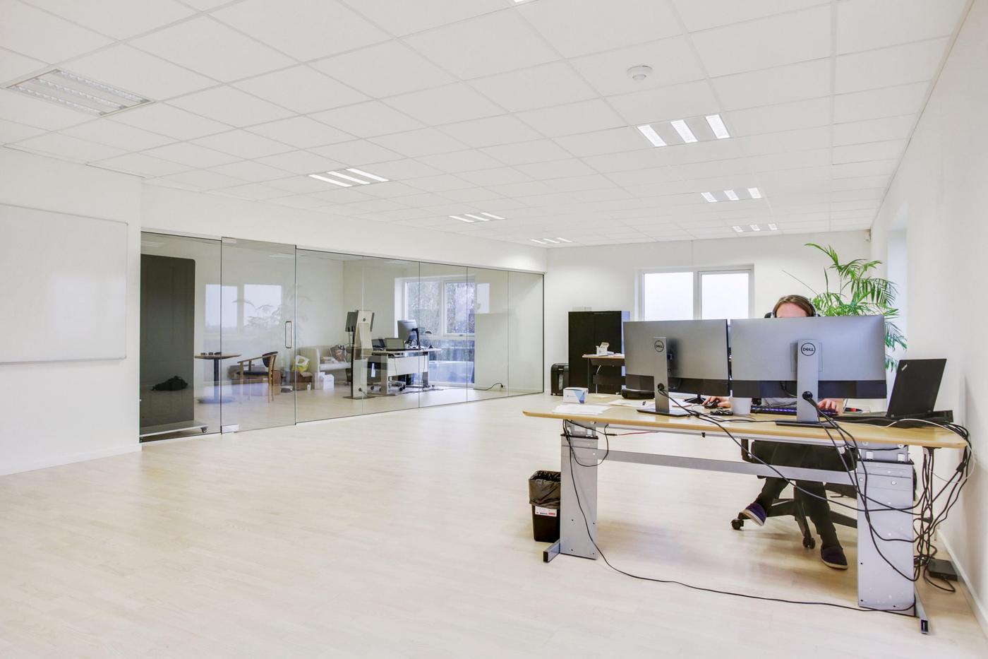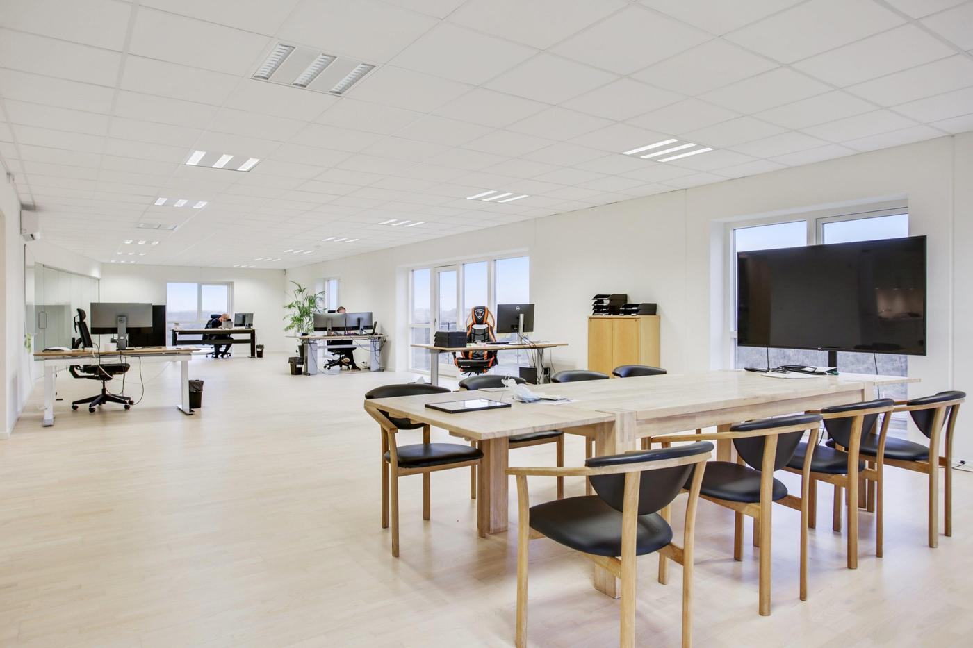 Indretning: Lejemålet er i to plan. Stueetagen er indrettet med en entre hvorfra der er adgang til det store kontorlokale. Herudover er der to kontorer med glasvægge, et tekøkken, et kopirum/arkivrum og et toilet med bruseniche. 1. sal er indrettet med stort kontorlokale med tekøkken, depotrum, toilet og møderum med glasvæg.