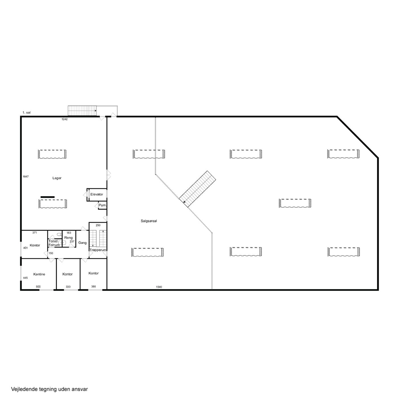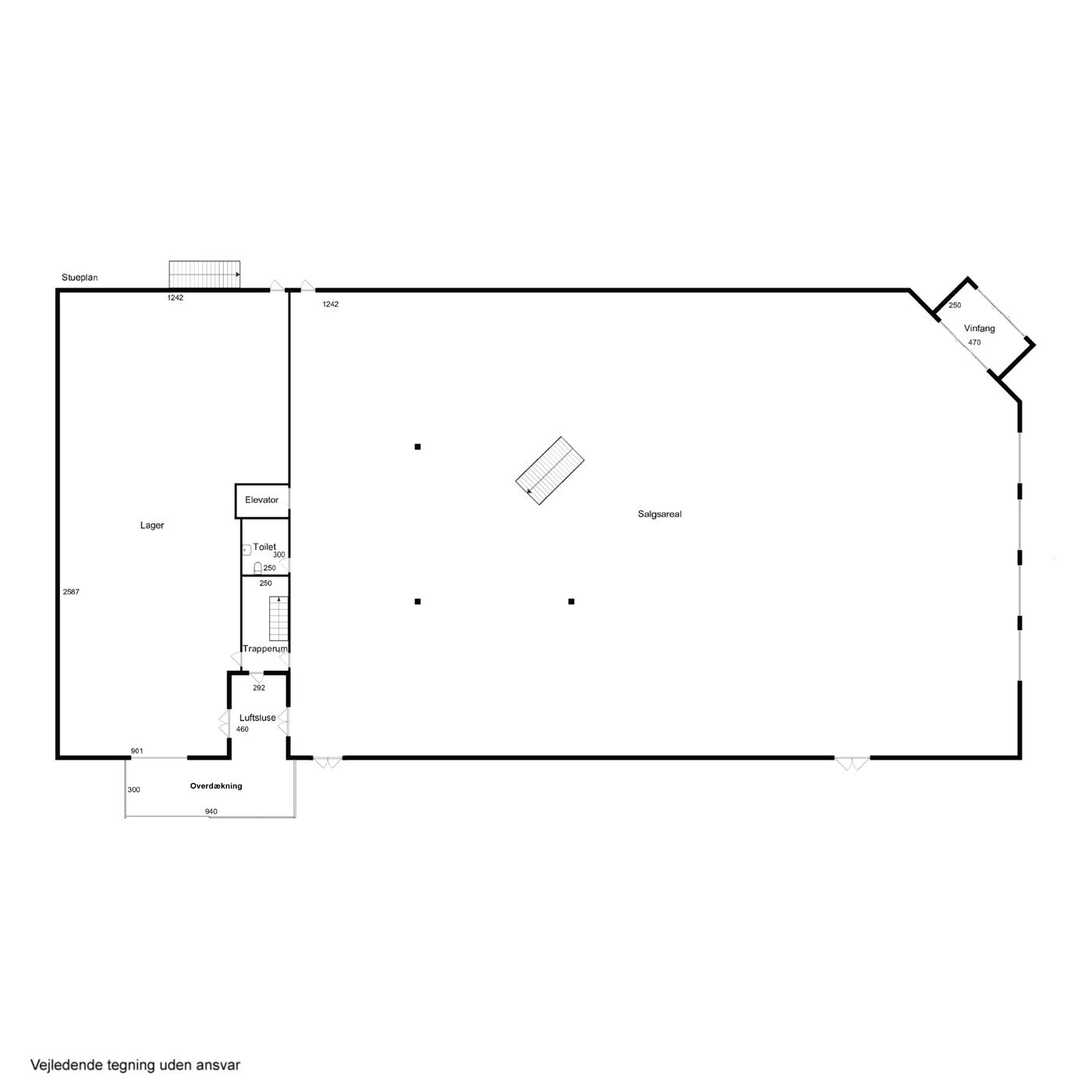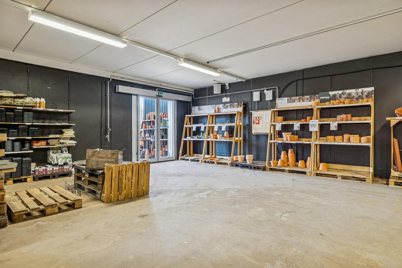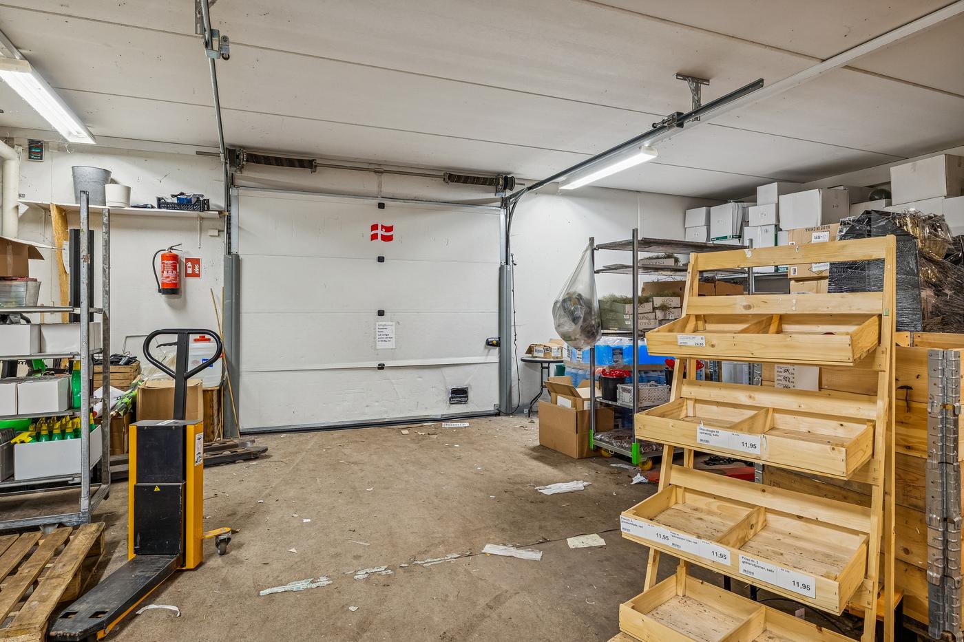 Traditionel boxbutik opført i betonelementer og med fladt tag med tagpap. Der er mange store ovenlysvinduer, der giver et dejligt lys ned i salgsarealet. Gulve i beton p.t. uden belægning, idet lejemålet senest har været anvendt til Billig Blomster. Indrettet med regulært salgsareal med vindfang og facadevinduer mod parkerings-pladsen. En større del af salgsarealet har et indskudt åbent dæk med ligeløbstrappe fra butiksgulvet. Endvidere er der elevator. Der er lager på to plan, hvor elevatoren ligeledes anvendes. Der er aluhejseport til lageret i stueplan. Der er kundetoilet i forbindelse med butiksarealet. På 1. salen er der tre kontorer, frokostrum og personaletoilet.