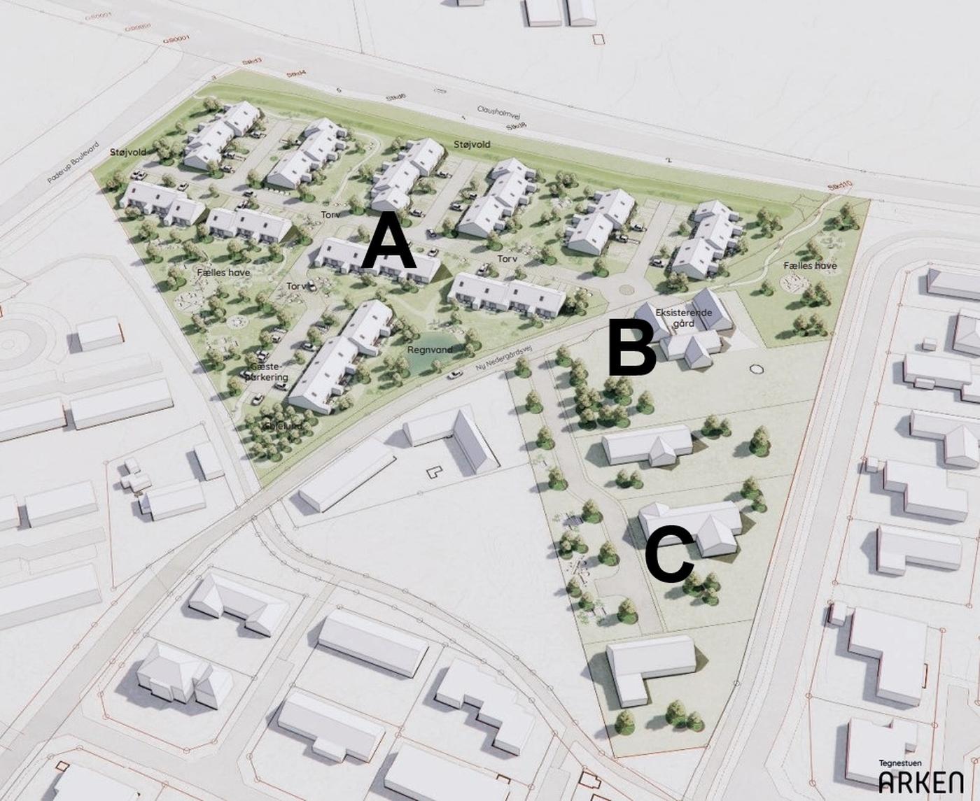 I henhold til Matrikelkort/tegning inde i salgsopstillingen omfatter denne salgsopstilling Område A (48 rækkehuse), men Område B (udstykning af den nuværende gård) og Område C (udstykning af tre store parcelhusgrunde) kan tillige erhverves enten i samme anpartsselskab eller i et nyt andet anpartsselskab.