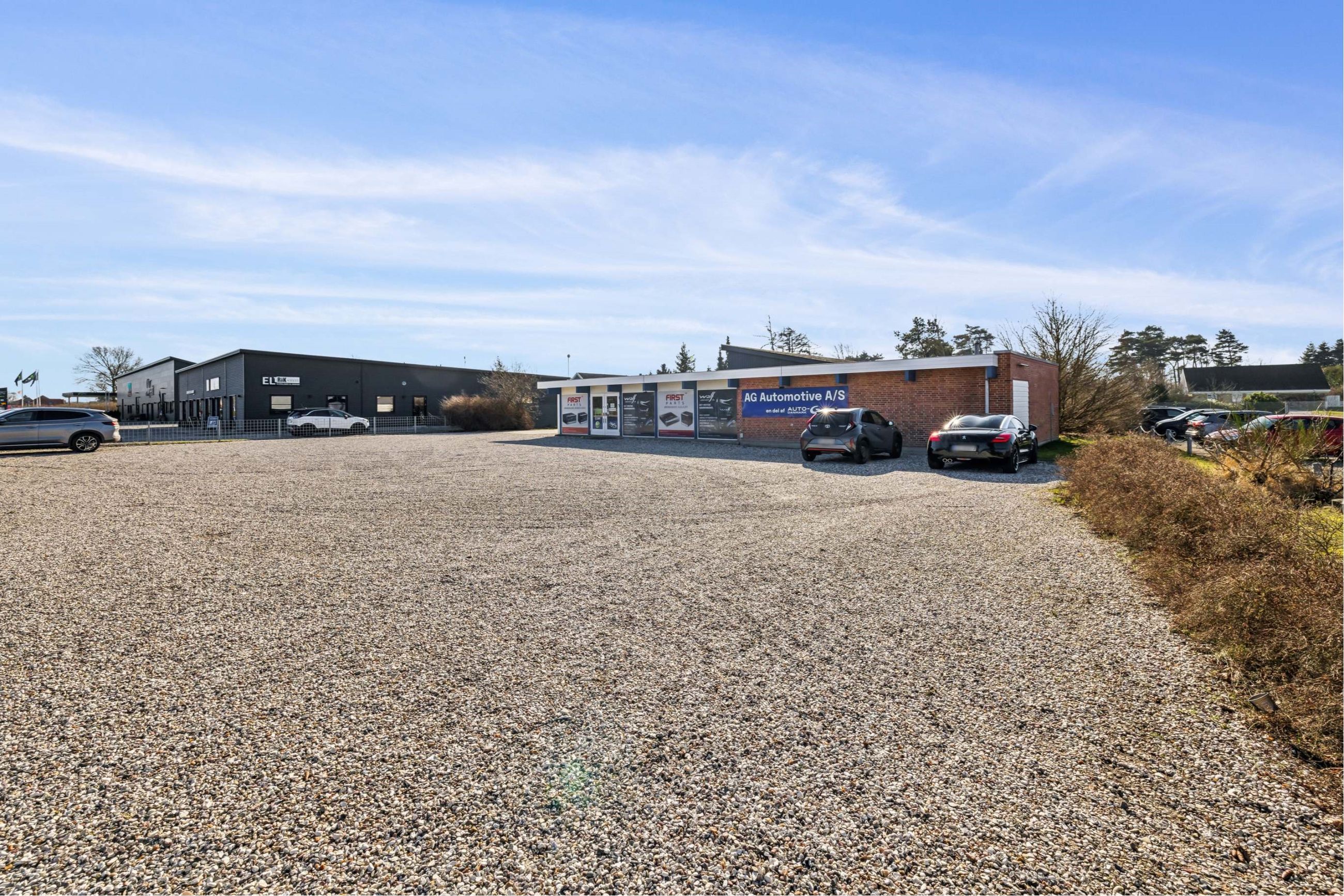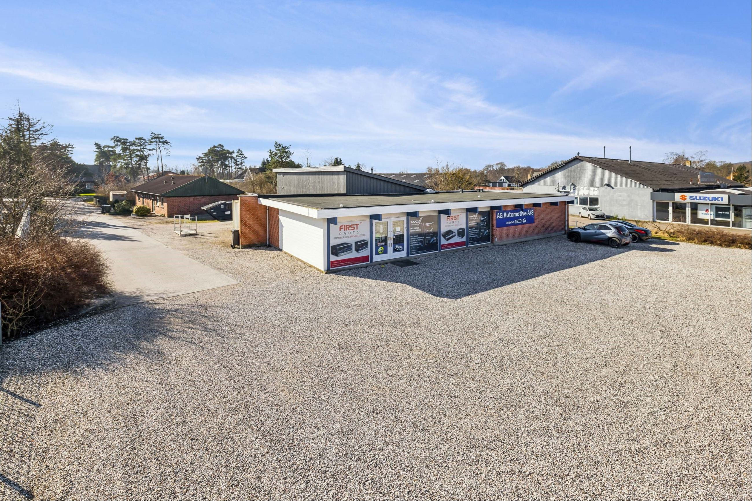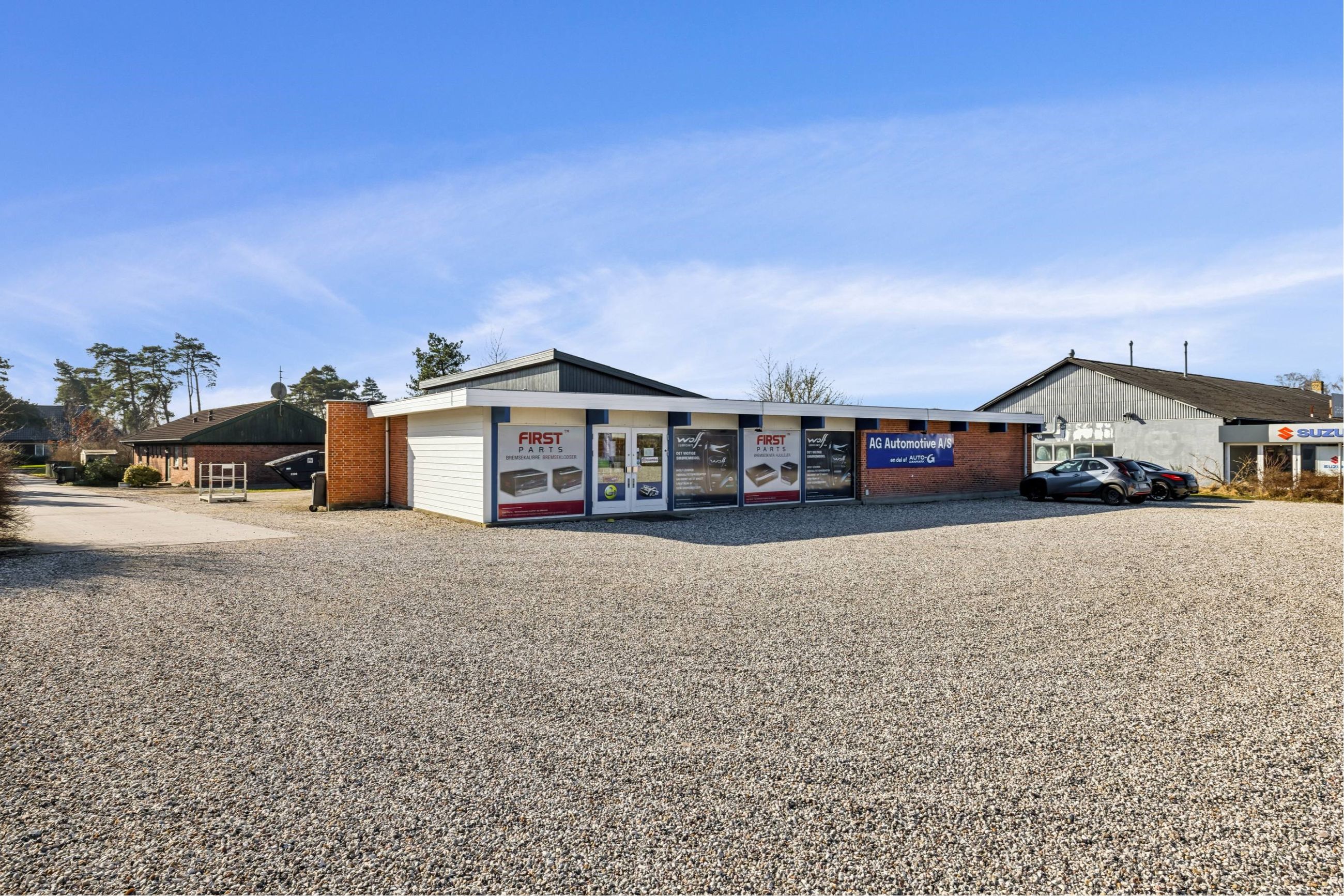 Velkommen til denne ejendom i hjertet af Auning, hvor mulighederne er mange og potentialet stort. Denne ejendom tilbyder både erhvervslokaler og en selvstændig bolig. Erhvervsdelen er på 356 m2 og indrettet som butik med tilhørende lagerfaciliteter. Grunden er på i alt 3.487 m2. Indretningen fordeler sig med butik og et fint og opvarmet lager med port adgang. Bygningen er opført i 1976 og 1983. Derudover er der en container til dæklager og 2 til alm lager samt en garage. Facaden er opført i mursten og med pap på taget. Den nedgravede olietank bliver fjernet. Der er fjernvarme.