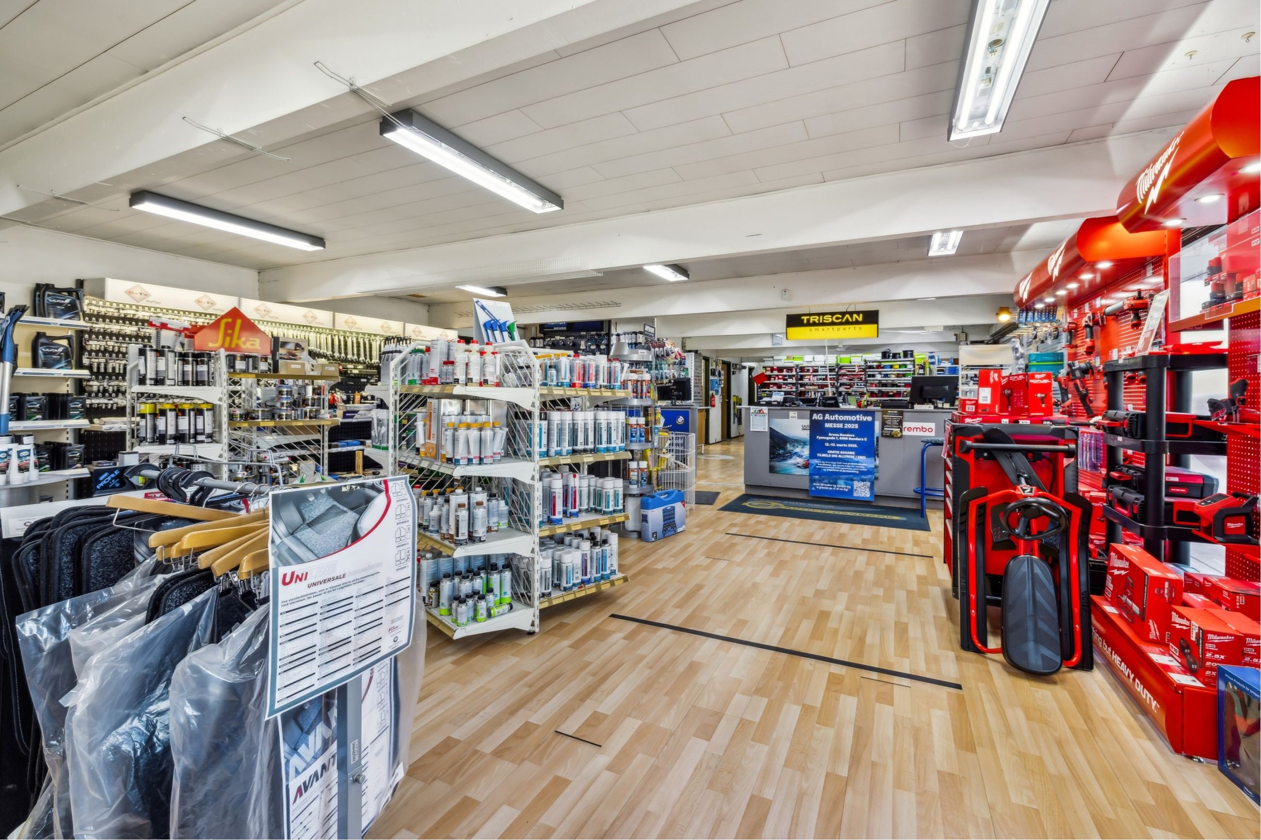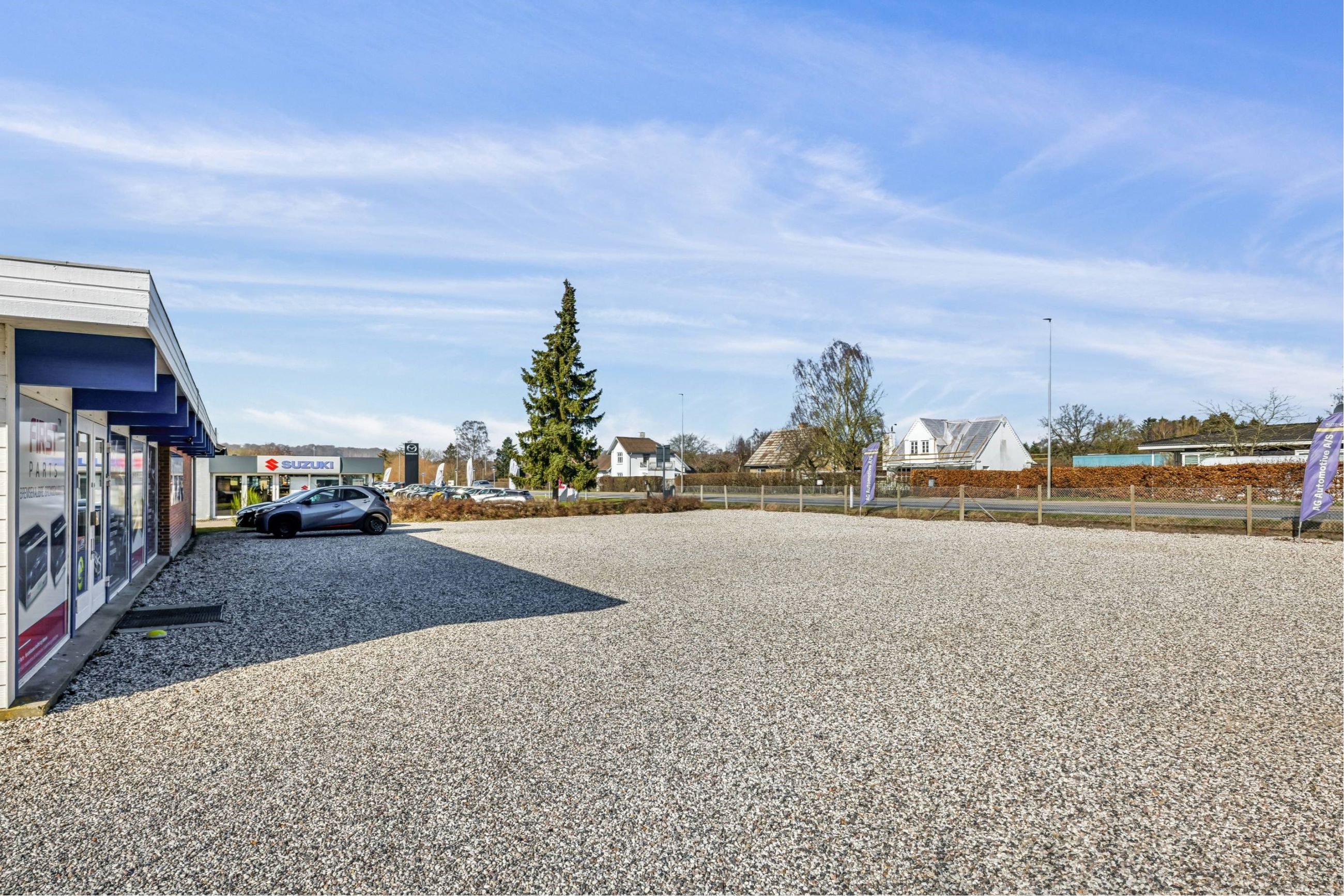 Ejendommen ligger strategisk placeret lige ud til hovedvejen gennem Auning, hvilket sikrer maksimal synlighed for butik samt let adgang for kunder. Foran butikken findes der desuden en stor parkeringsplads, så kunderne altid kan finde parkering uden besvær.