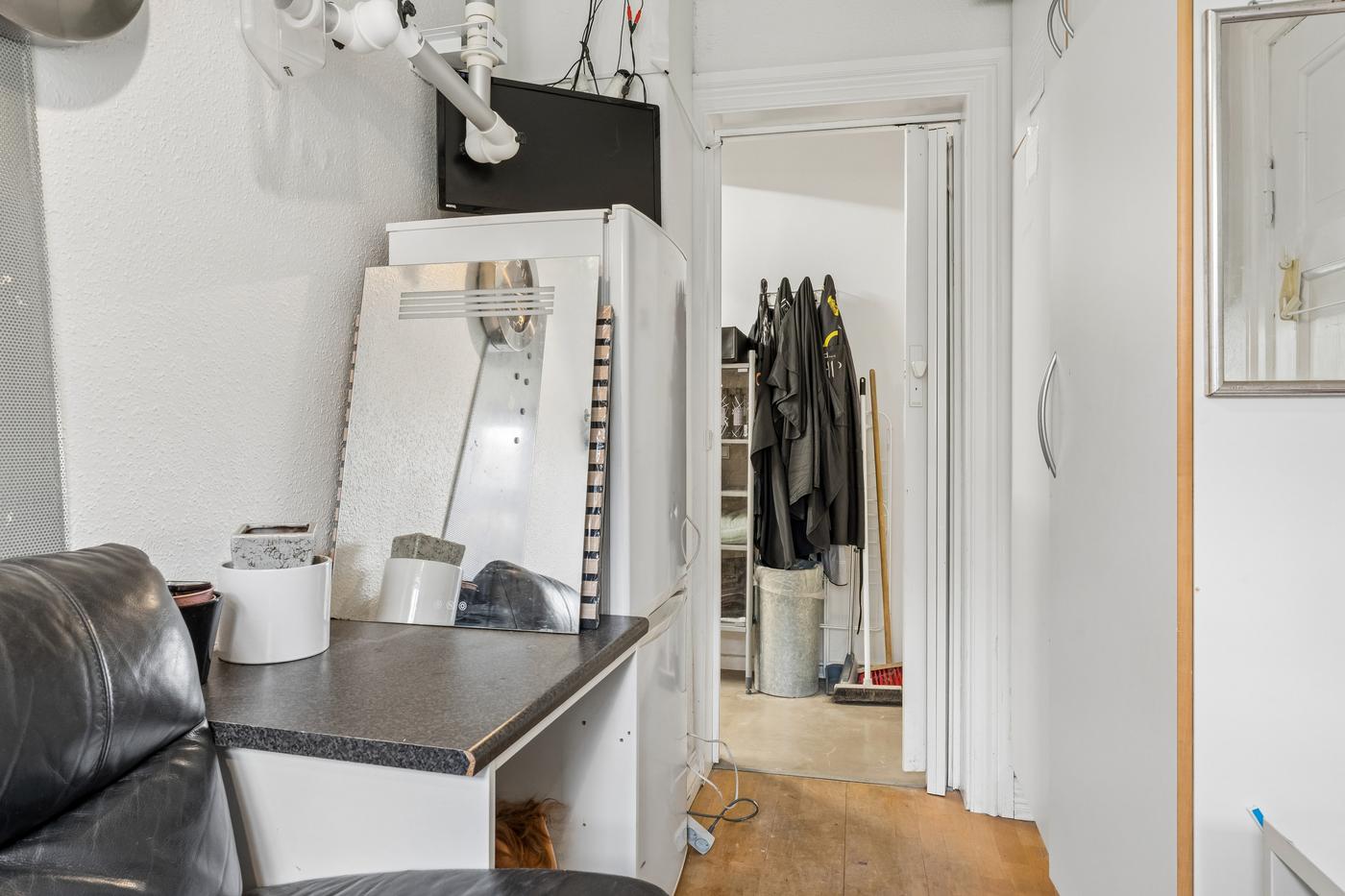Til lejemålet hører desuden et tekøkken med udsugning, som giver gode rammer for opbevaring af produkter, håndklæder og øvrigt udstyr til den daglige drift. Derudover er der et tilhørende toilet.