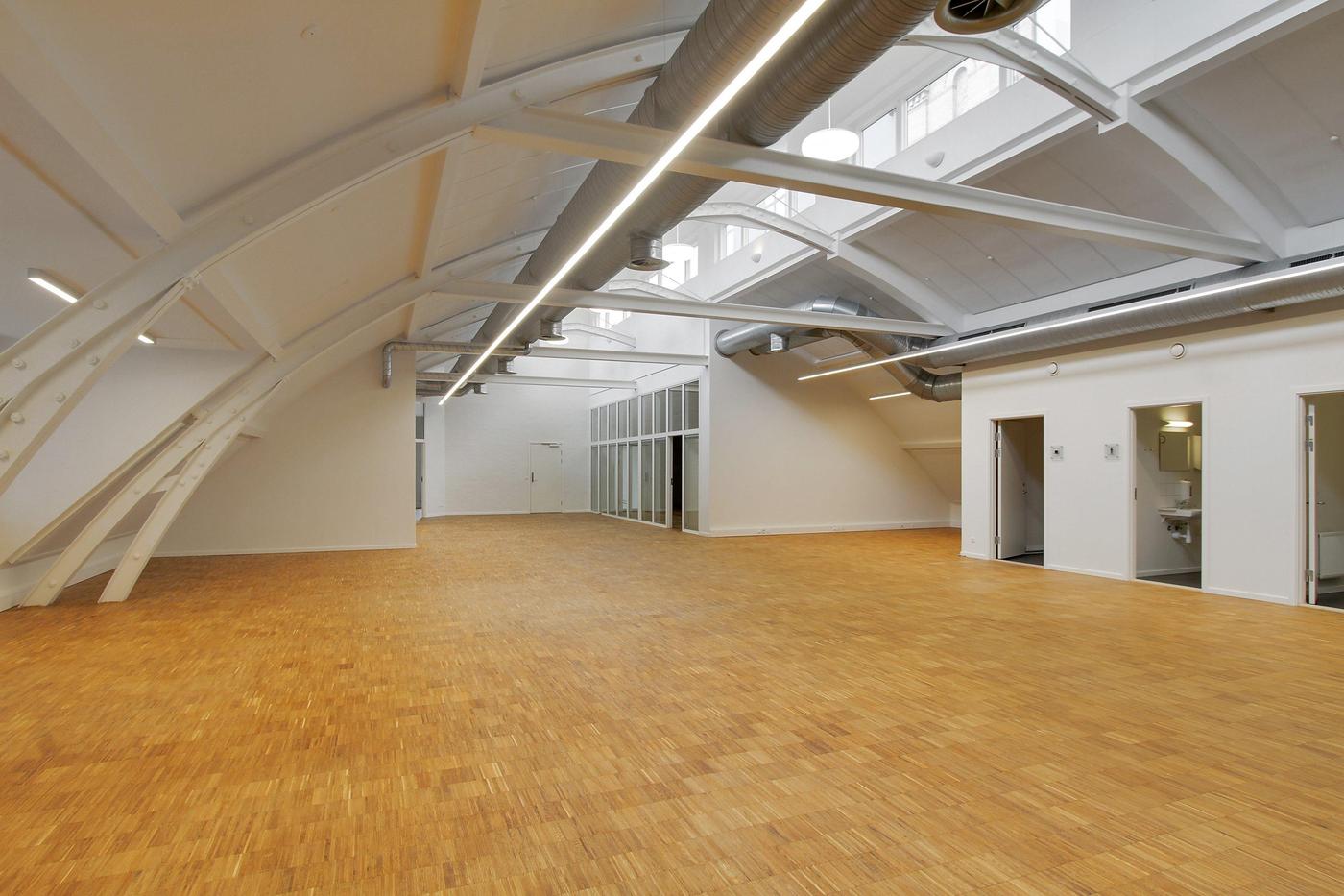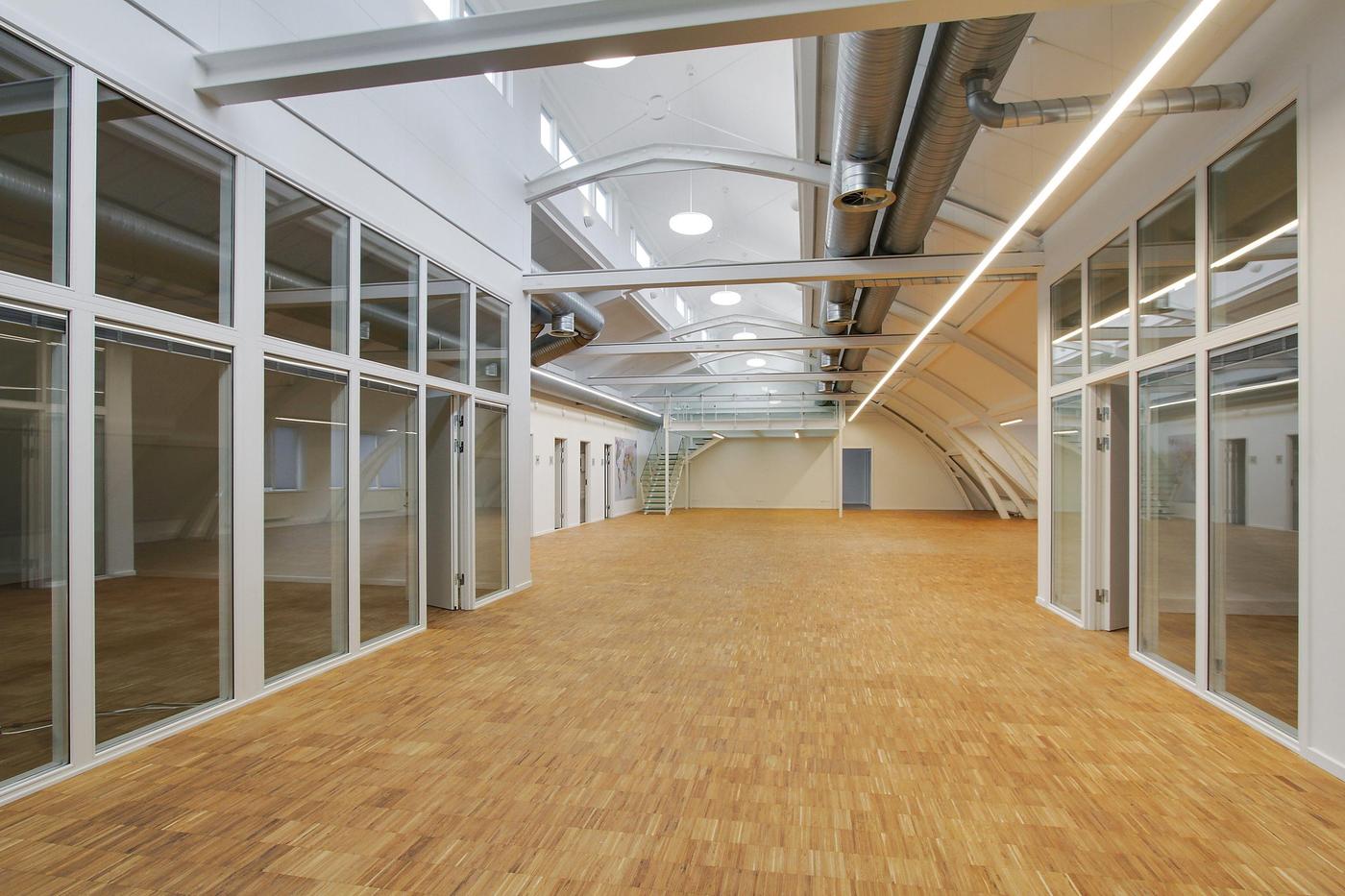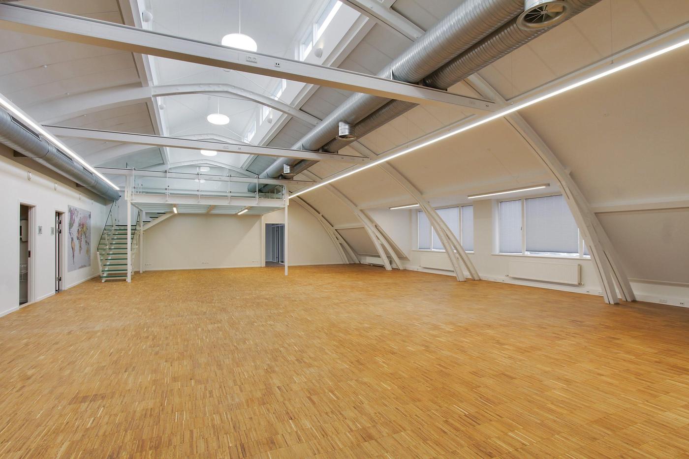 Lejemålet er beliggende på 1. sal, der er indrettet i den helt rigtige stil i en kombination af storrumskontor og åbne miljøer og 4 stk. cellekontorer og et stort mødelokale. Der er desuden mulighed for etablering af yderligere 2 cellekontorer. Kontorer og mødelokale er delvist opbygget med vægge i glas og gulvene i lejemålet er belagt med listestavparket. Endvidere er der mindre te-køkken og 3 toiletter, hvoraf det ene har badefaciliteter. Etagen fremtræder med højt til loftet, der følger tagformen med de synlige buede spær. Det gennemgående rytterlys understreger med det naturlige ovenlys lejemålets helt specielle og unikke form.
