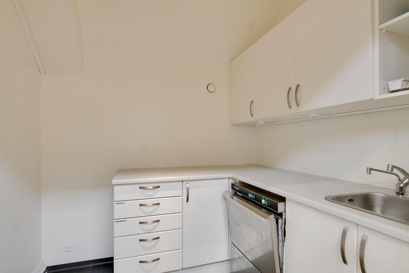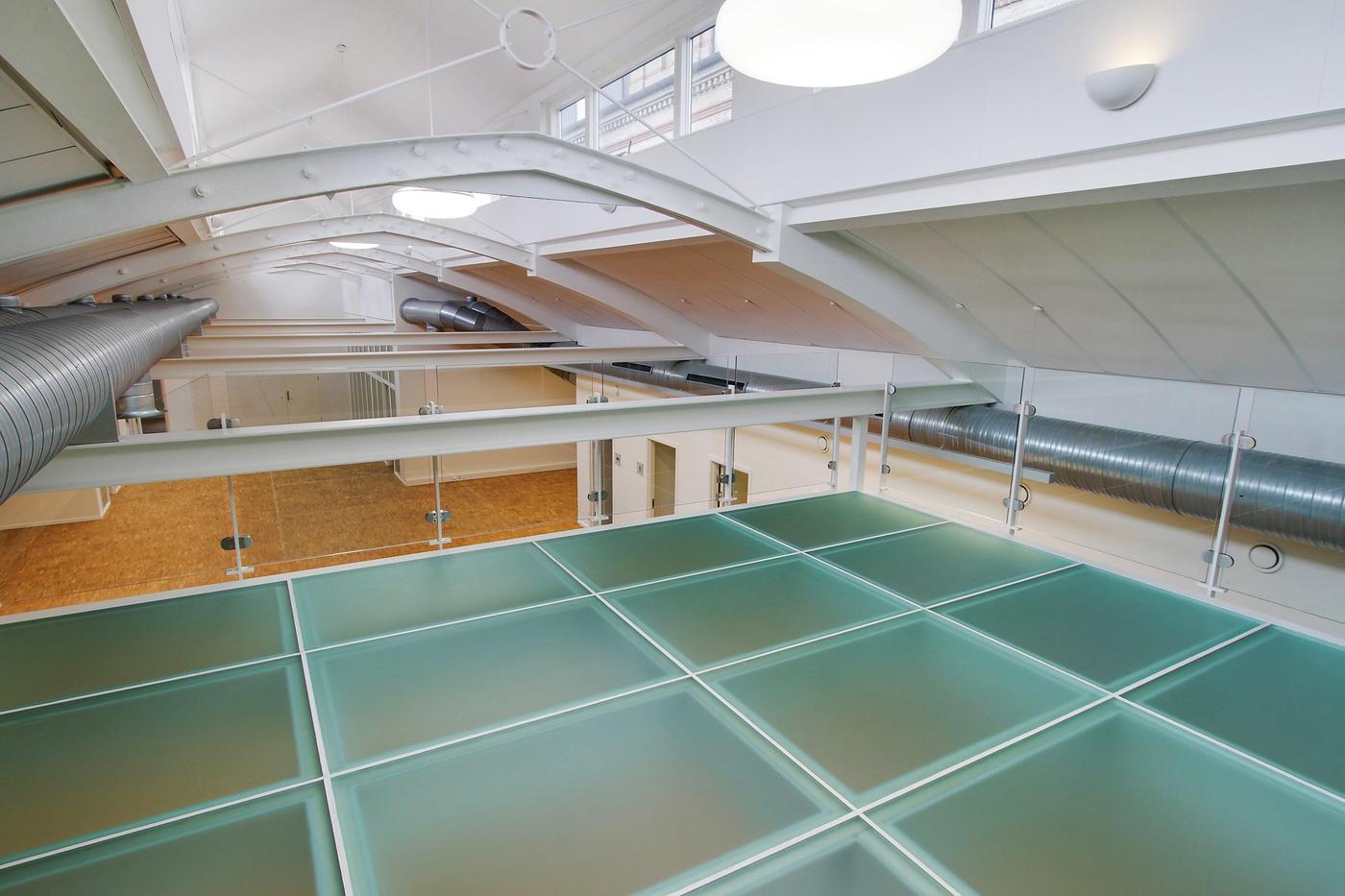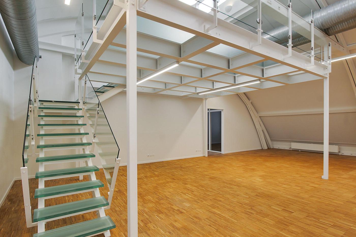 Lejemålet er beliggende på 1. sal, der er indrettet i den helt rigtige stil i en kombination af storrumskontor og åbne miljøer og 4 stk. cellekontorer og et stort mødelokale. Der er desuden mulighed for etablering af yderligere 2 cellekontorer. Kontorer og mødelokale er delvist opbygget med vægge i glas og gulvene i lejemålet er belagt med listestavparket. Endvidere er der mindre te-køkken og 3 toiletter, hvoraf det ene har badefaciliteter. Etagen fremtræder med højt til loftet, der følger tagformen med de synlige buede spær. Det gennemgående rytterlys understreger med det naturlige ovenlys lejemålets helt specielle og unikke form.