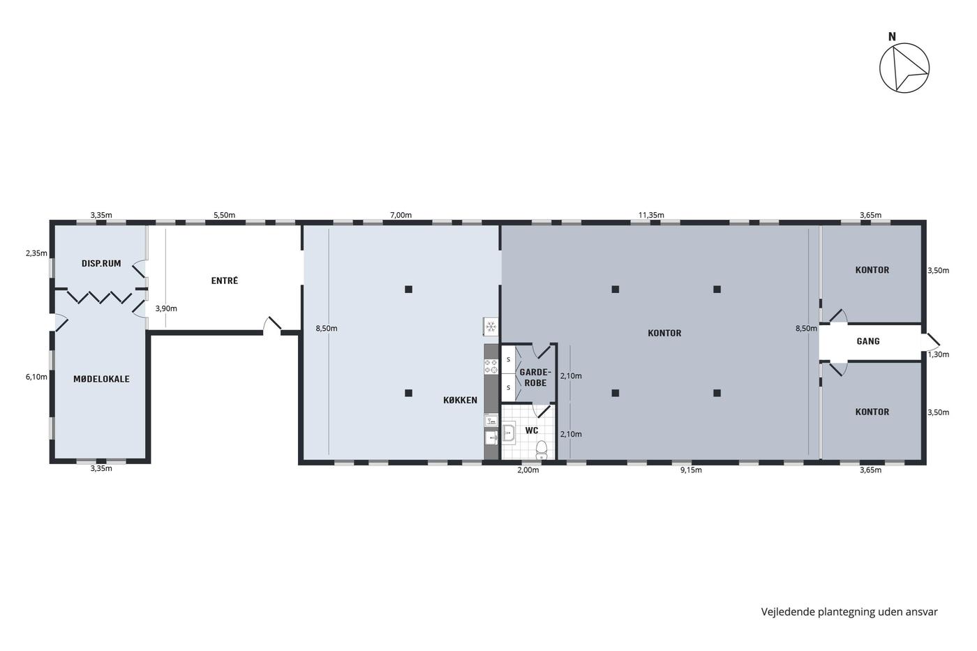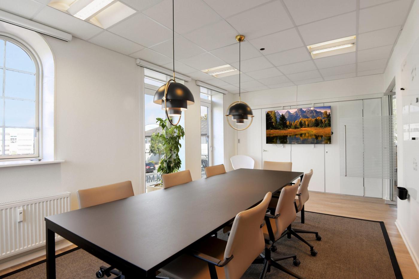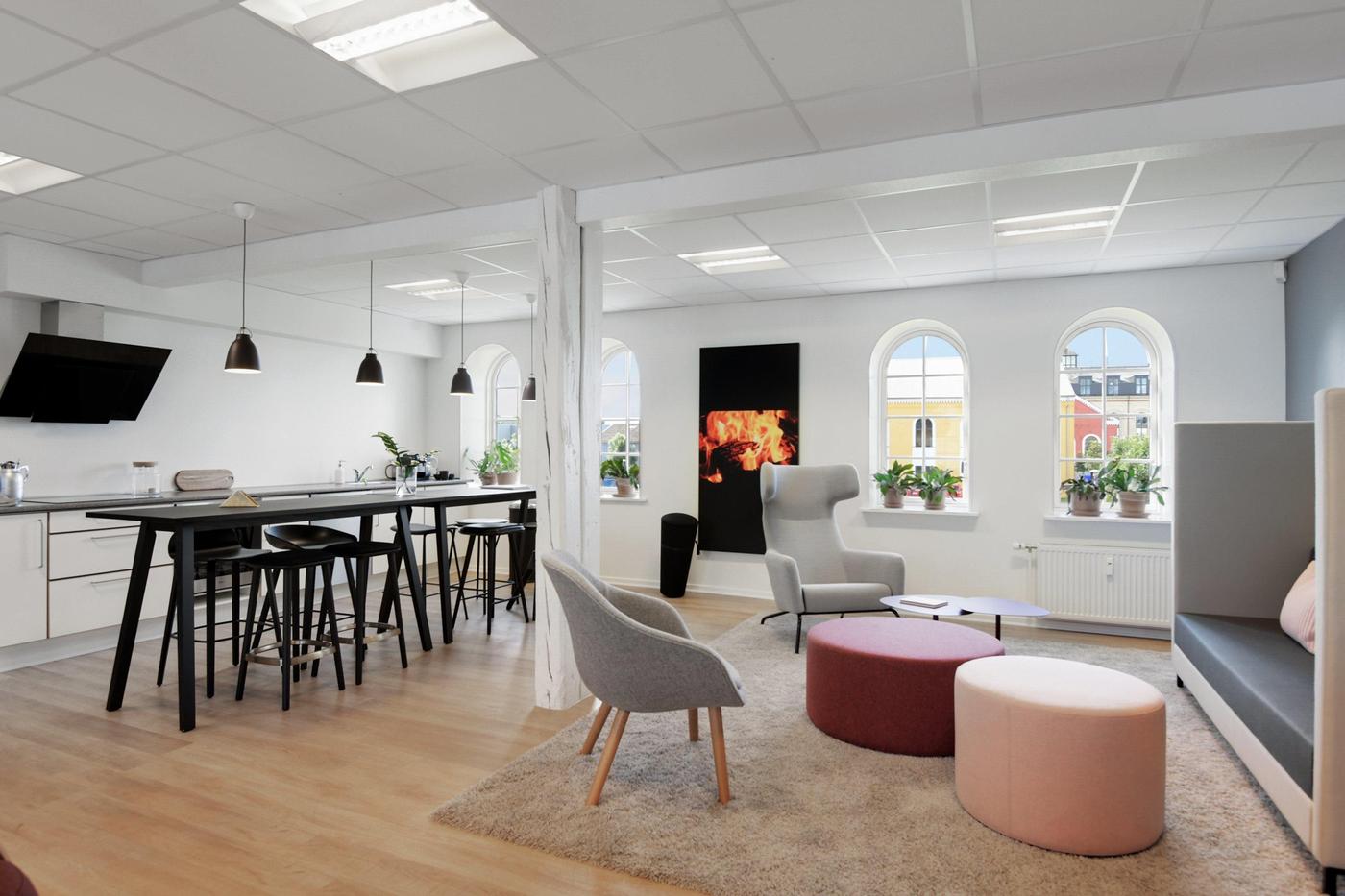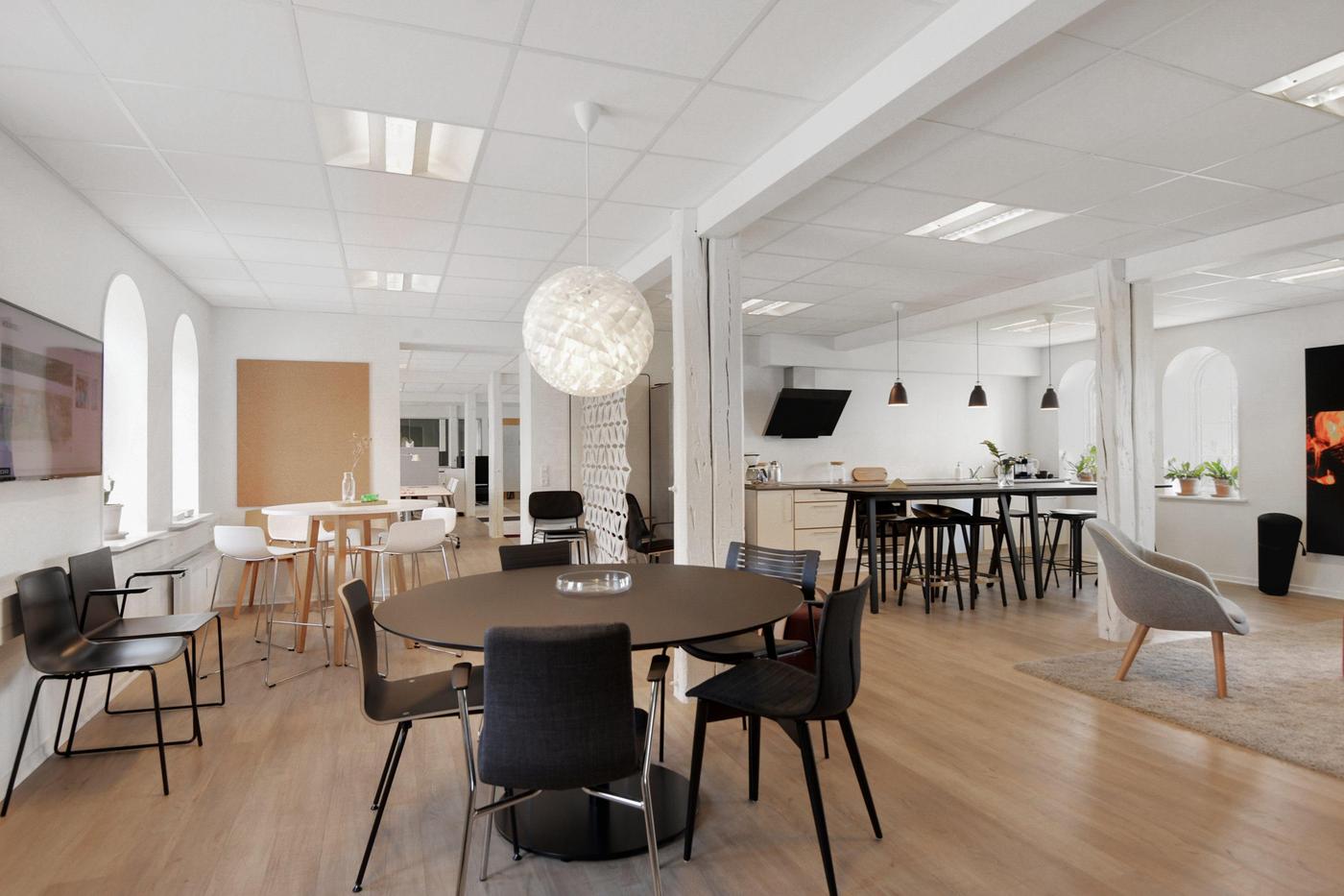 Lejemålet er indrettet med et åbent receptionsområde/entré. Herfra er der direkte adgang til lyst og stor mødelokaler, som via intern foldevæg kan opdeles i 2 mødelokaler såfremt dette ønskes. Herudover forefindes storrumskontor med plads til mindst 10 arbejdsstationer, 2 mindre chefkontorer og et præsentabelt køkken med gode spiseplads