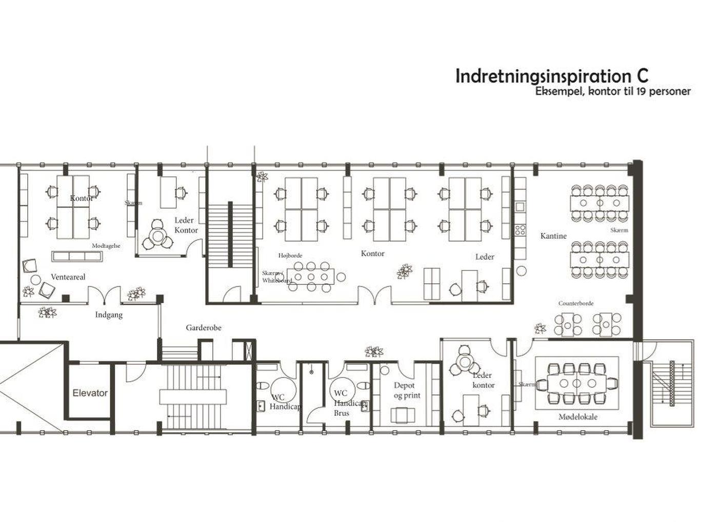 Indenfor bydes man velkommen af et præsentabelt, fælles indgangsparti med mulighed for infoskærme. Lejemålet er på 425 m² og er beliggende i stueetagen i ejendommens A-fløj. Lejemålet leveres med en basisindretning bestående af ny gulvbelægning, nye lydlofter og nymalede vægge. Yderligere special indretning kan aftales nærmere med udlejer. Udbudslejen er fastsat under forudsætning af, at lejemålet overtages i basisindretning,- men lejemålene kan efter nærmere aftale indrettes, mod at udlejers udgift hertil kapitaliseres over huslejen efter nærmere aftale parterne imellem. Der er mulighed for indretning til kontor- elle kliniklejemål. Se iøvrigt indretningsforslag i lejeopstillingen, som kan downloades.