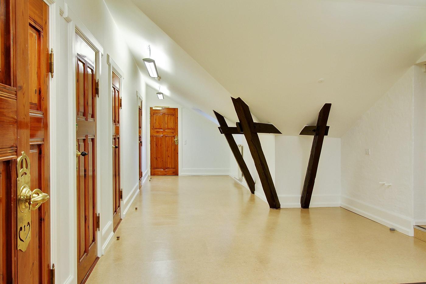 Flot trappe til 1. sal som ligeledes er indrettet medåbent kontor med synlige bjælkekonstruktioner og rytterlys som giver et flot lysindfald i lokalet samt udsigt over Jomfru Ane Parken og Limfjorden. Endvidere 4 toiletter på 1. sal.