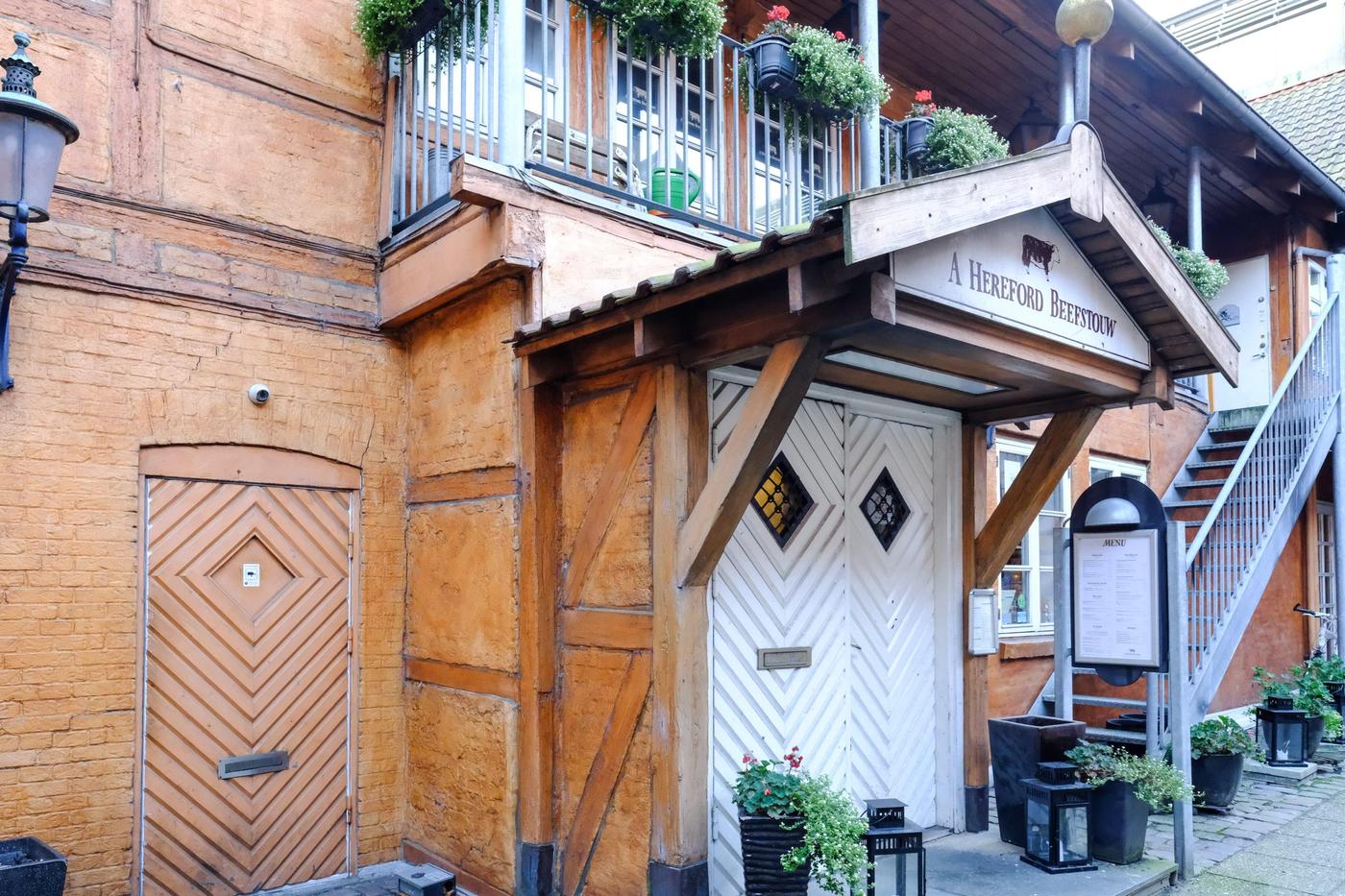 Restauranten, A Hereford Beefstouw, Aalborg afstås. Landets nordligste A Hereford Beefstouw ligger hyggeligt placeret i den historiske "Simonis gård" i hjertet af Aalborg. Her bydes der på bindingsværksidyl og byens bedste bøffer af det bedst tænkelige oksekød. "Simonis gård", som danner rammerne om A Hereford Beefstouw, var i gamle dage hjemsted for en af Nordjyllands større vinhandlere. Nogle af vingårdens gamle egetræsfade pryder væggene i det gamle bindingsværk.