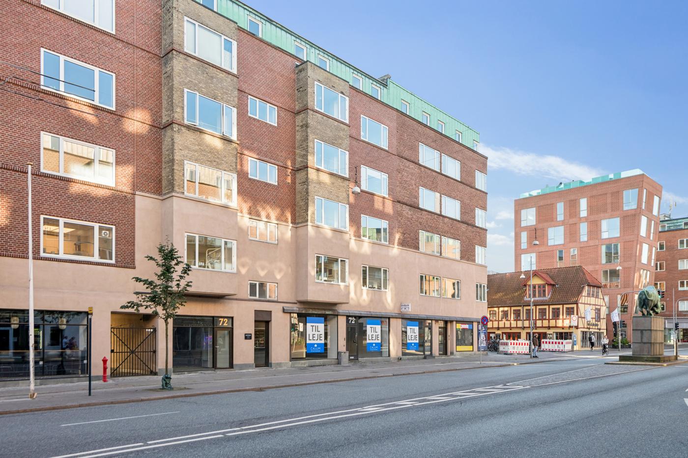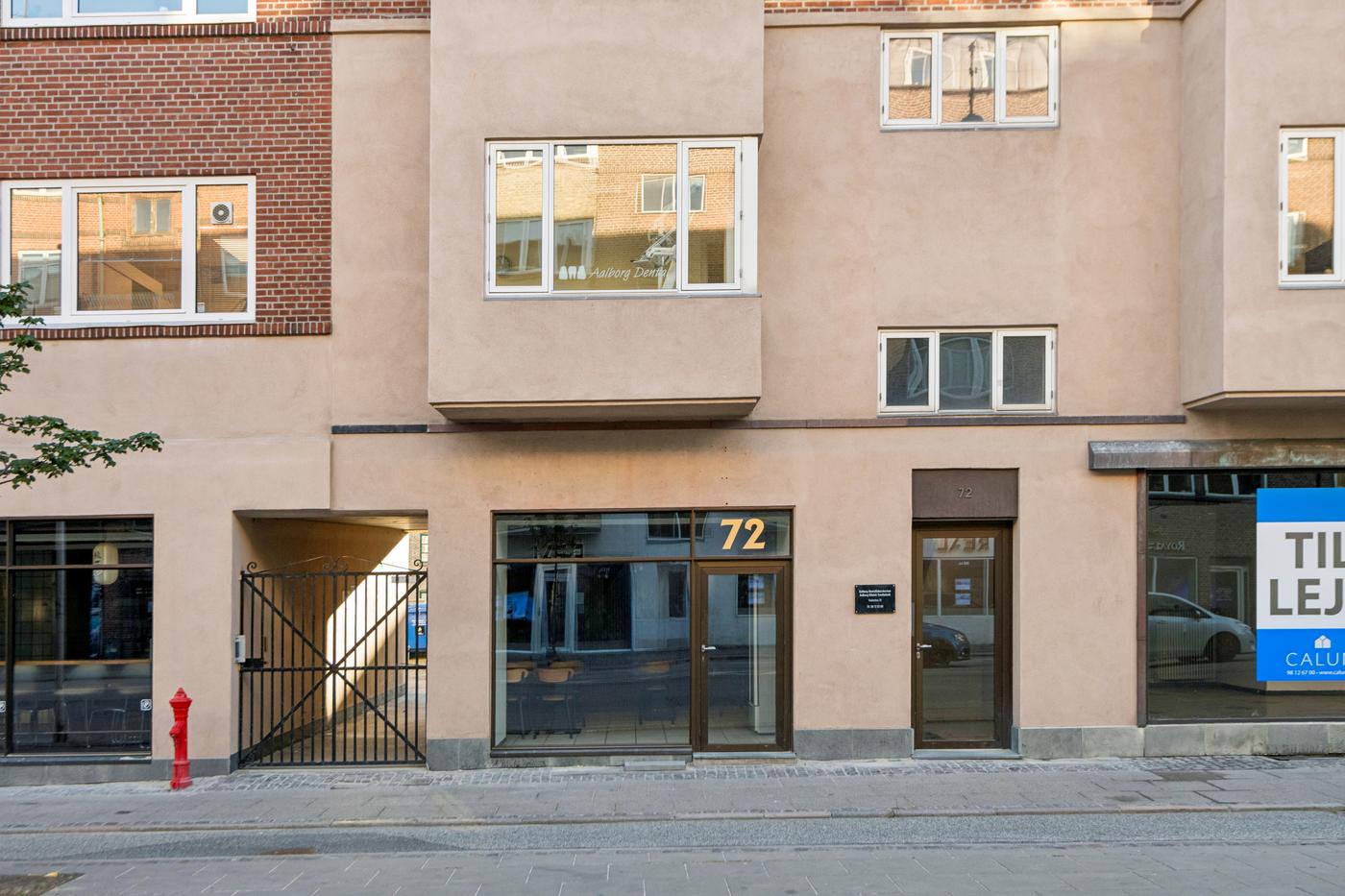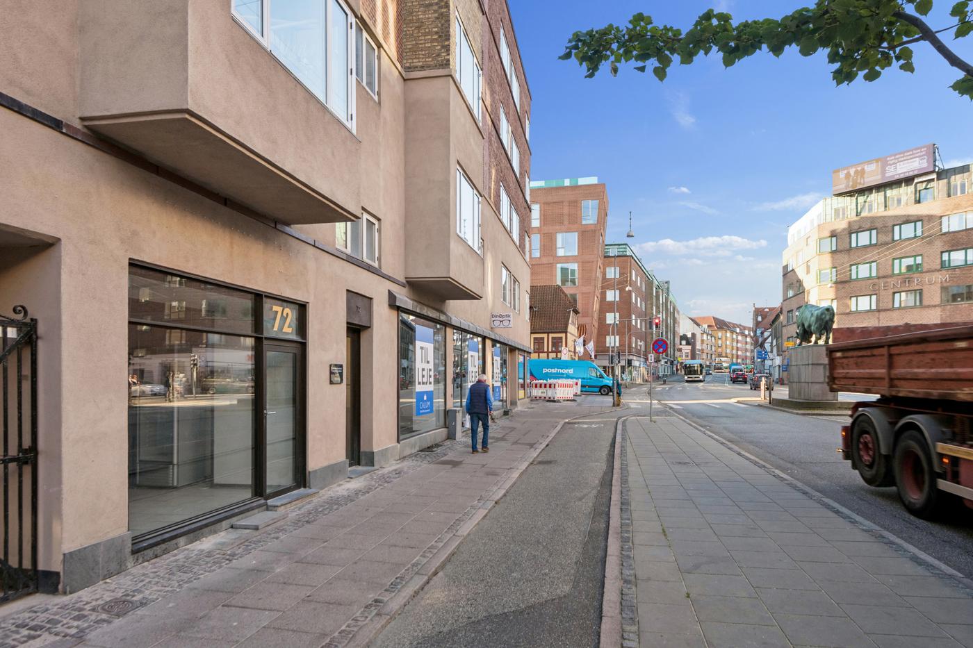 Attraktivt mindre erhvervslokale på 34 m² beliggende tæt ved gågaden og det kendte vartegn Cimbertyren, hvilket sikrer høj synlighed og god eksponering mod forbipasserende.