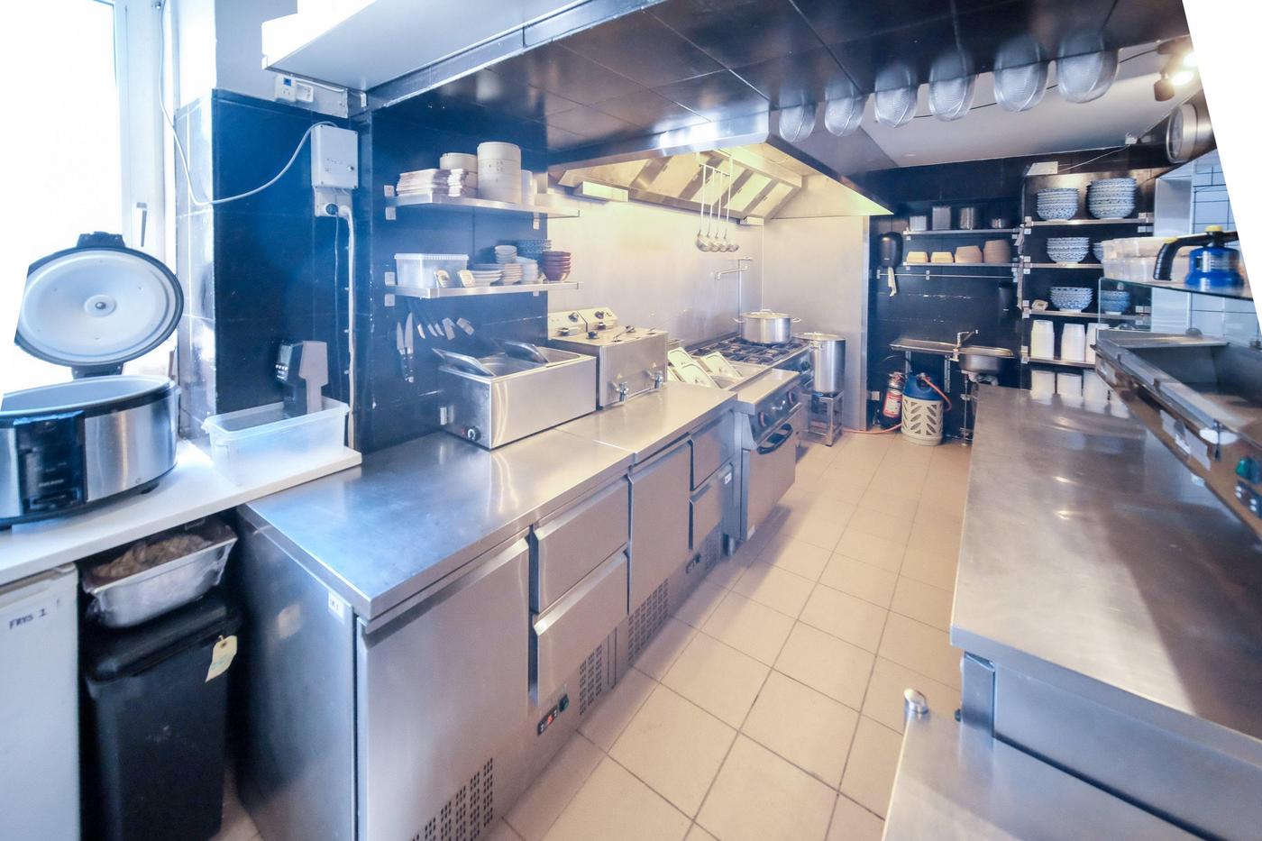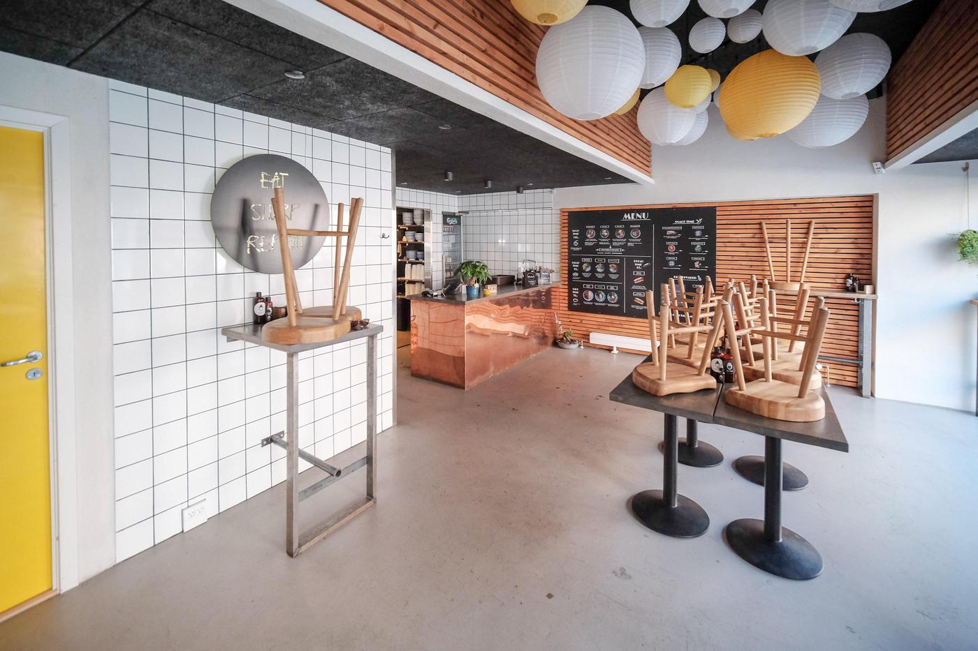 Stueplan på 83 m² er indrettet med ca. 20-25 siddepladser i restauranten, som evt. også kan anvendes alene som take-away. Derudover er der kundetoilet, mindre opbevaring samt velindrettet køkken. I kælderen, der er 37 m², er der personalefaciliteter samt gode lagerrum med bl.a. køle- og fryseskabe.