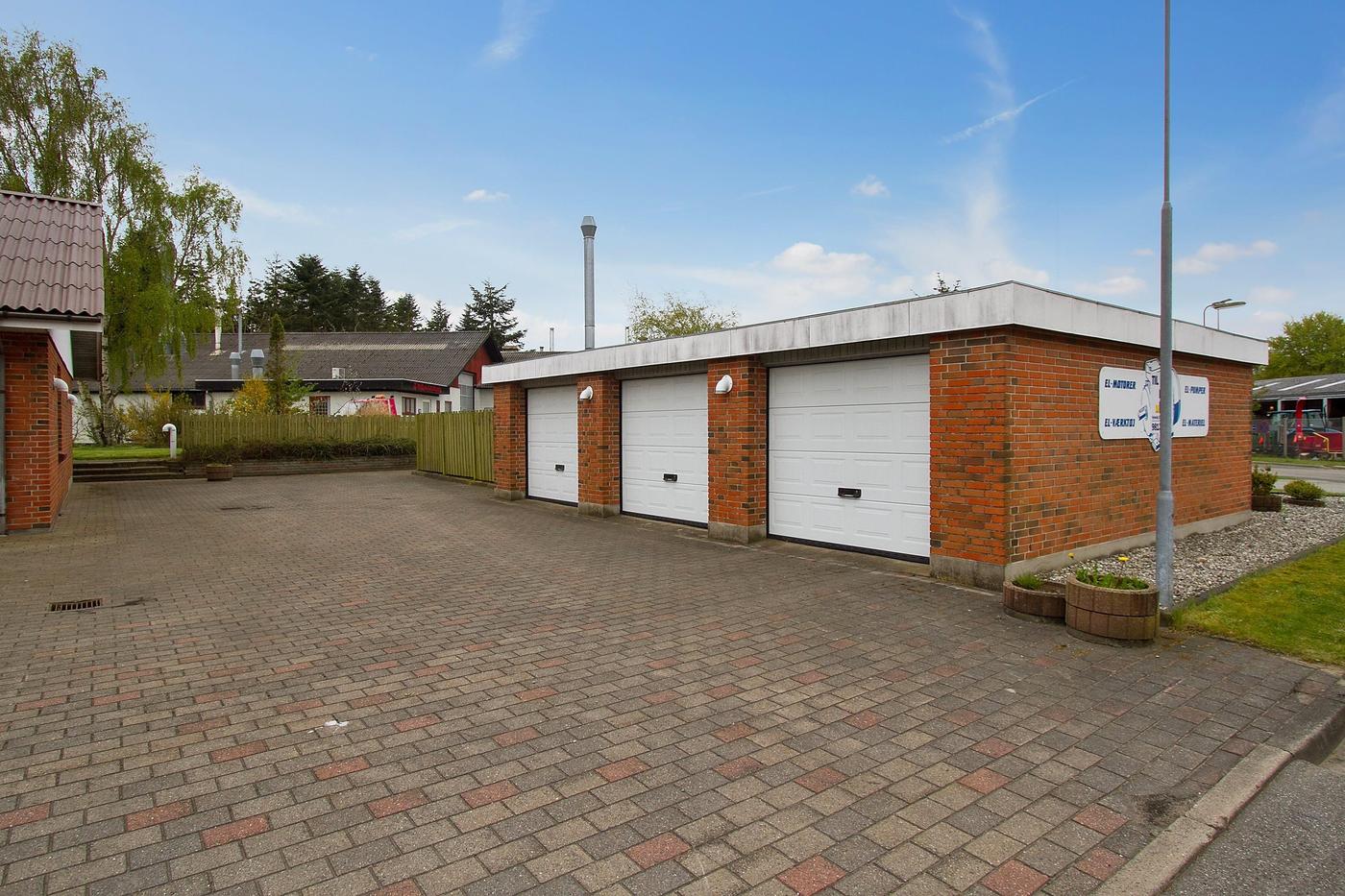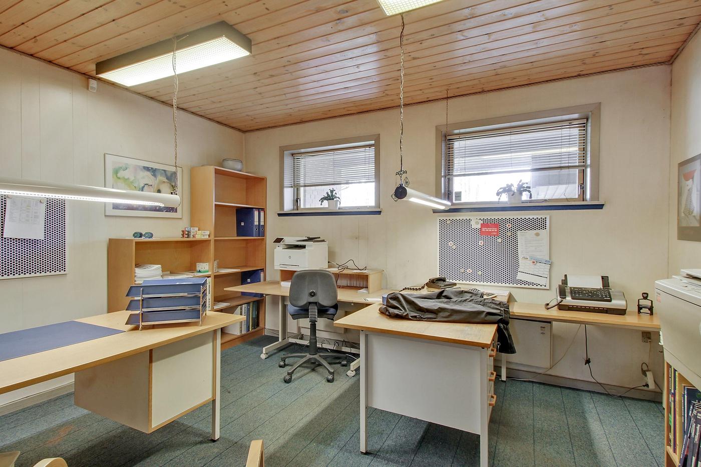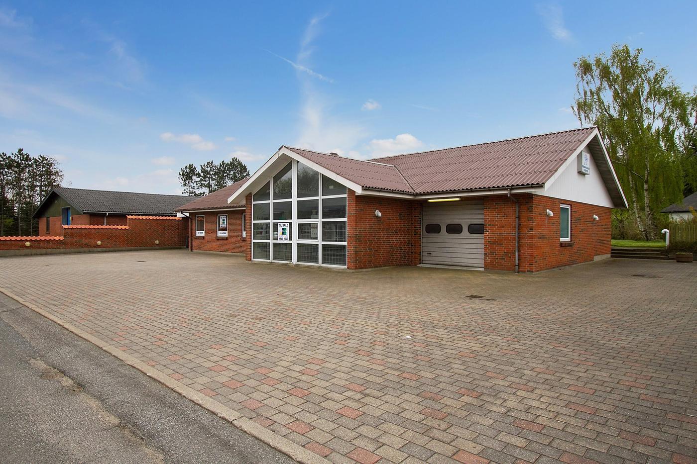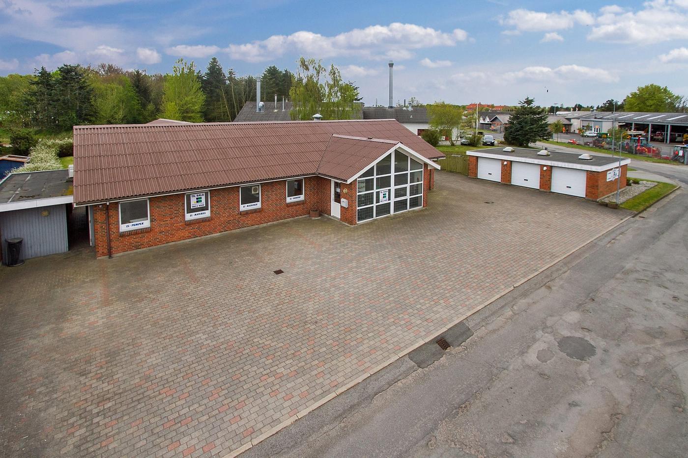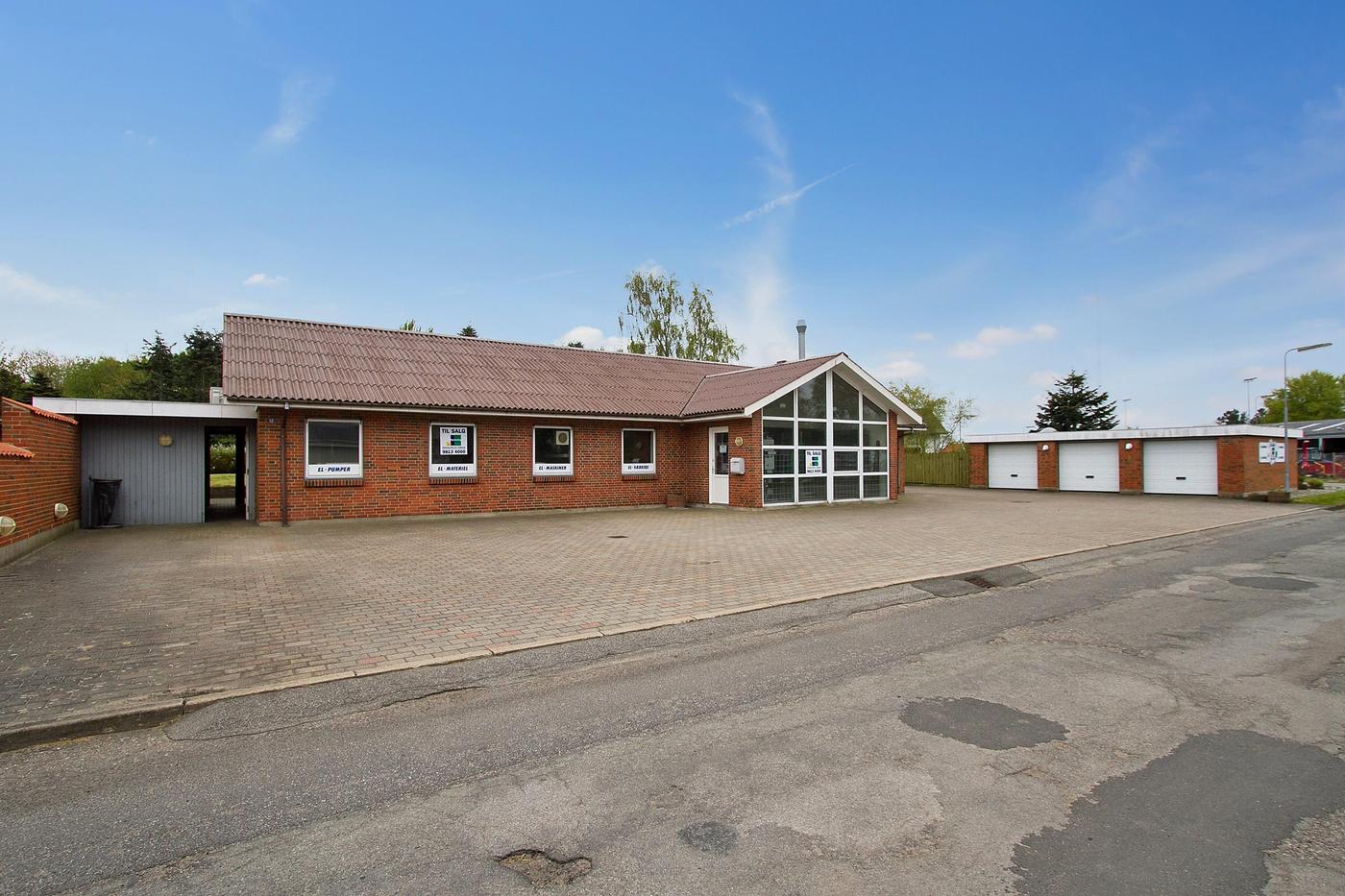 Til ejendommens erhvervsafsnit hører indgangsparti, der i dag anvendes som showroom, og værkstedet har toilet/bad, mindre køkken/frokostrum og kontor. Der er portadgang til erhvervslejemålet. Desuden medfølger til erhvervslejemålet, en garagebygning med 3 lukkede garager med hvide vedligeholdelsesfrie plastporte.