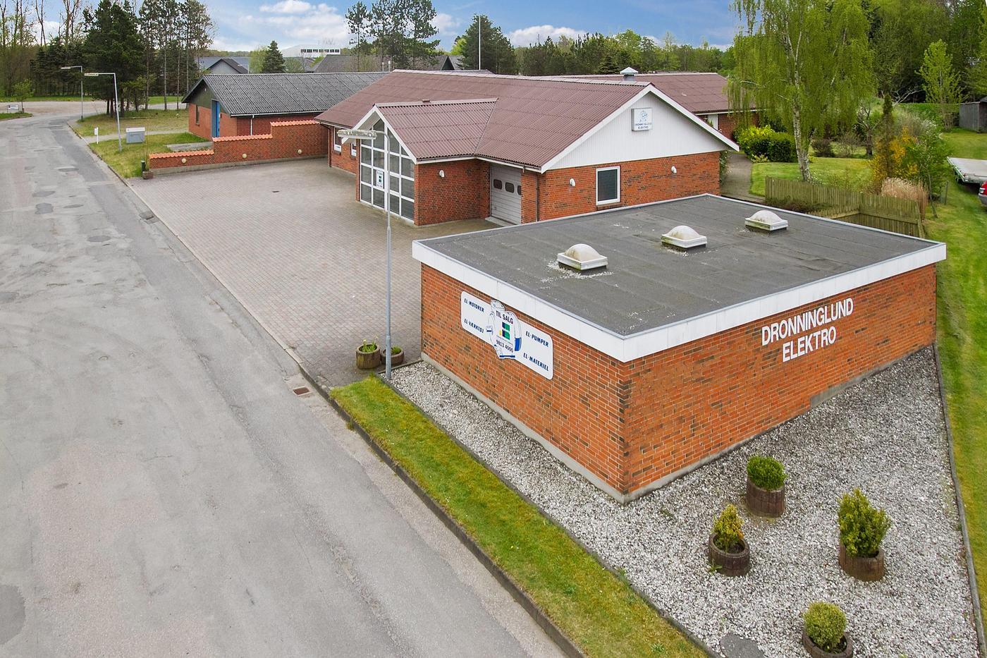I Dronninglunds erhvervskvarter udbydes velholdt erhvervsejendom på i alt 482 m² til salg. Ejendommen består af 130 m² bolig, 257 m² værksted inkl. showroom og kontorfaciliteter samt 66 m² dobbeltgarage registreret som erhvervsareal og 29 m² uopvarmet carport.