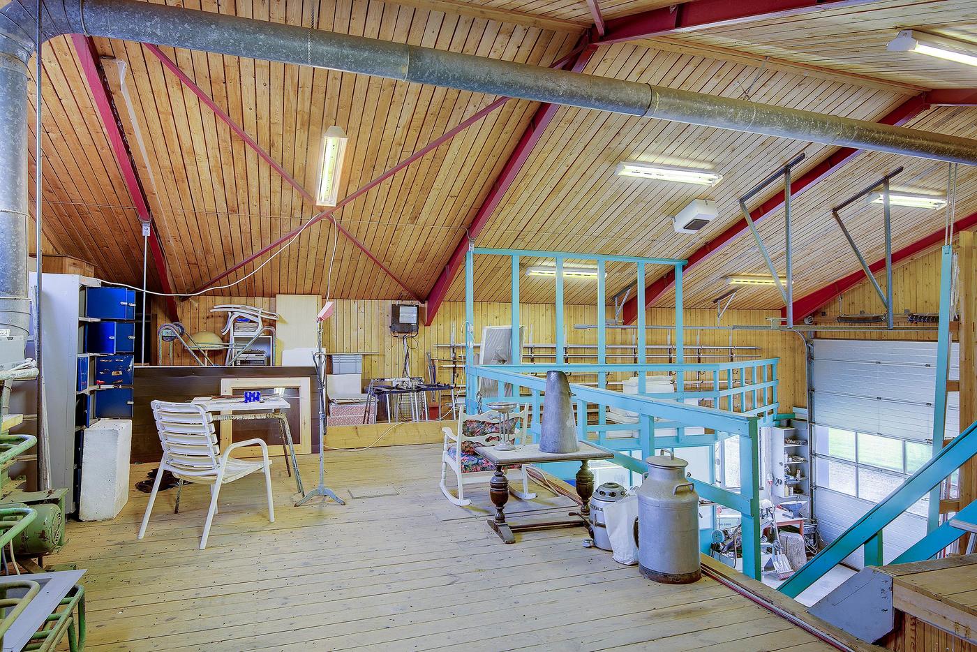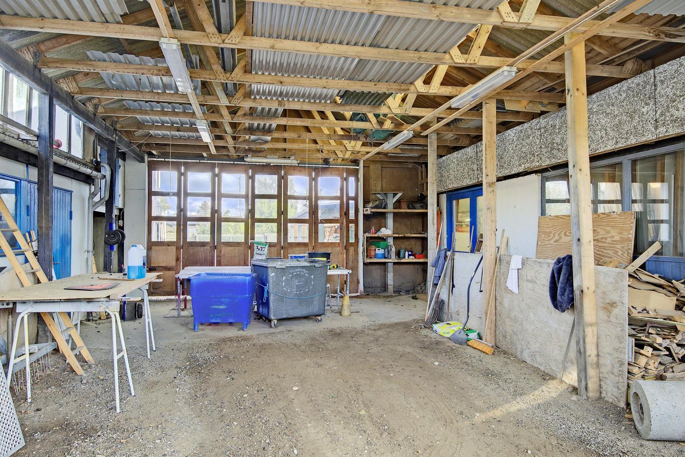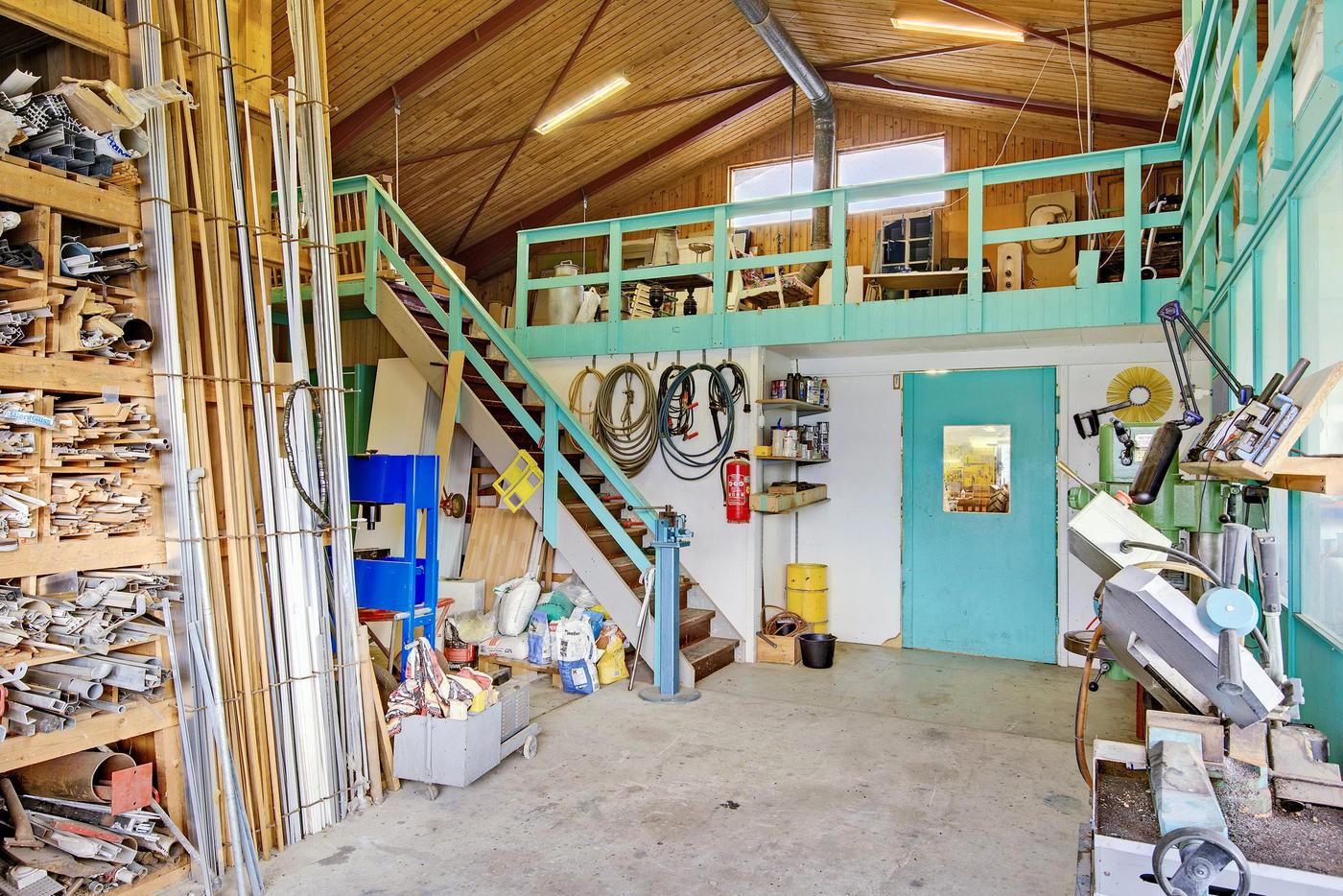 Ejendommen er blevet benyttet til tømrervirksomhed siden 1979, så er der adskillige muligheder for opbevaring af træ og lignende i forskellige størrelser og mål under halvtage og i det højtloftede lager.