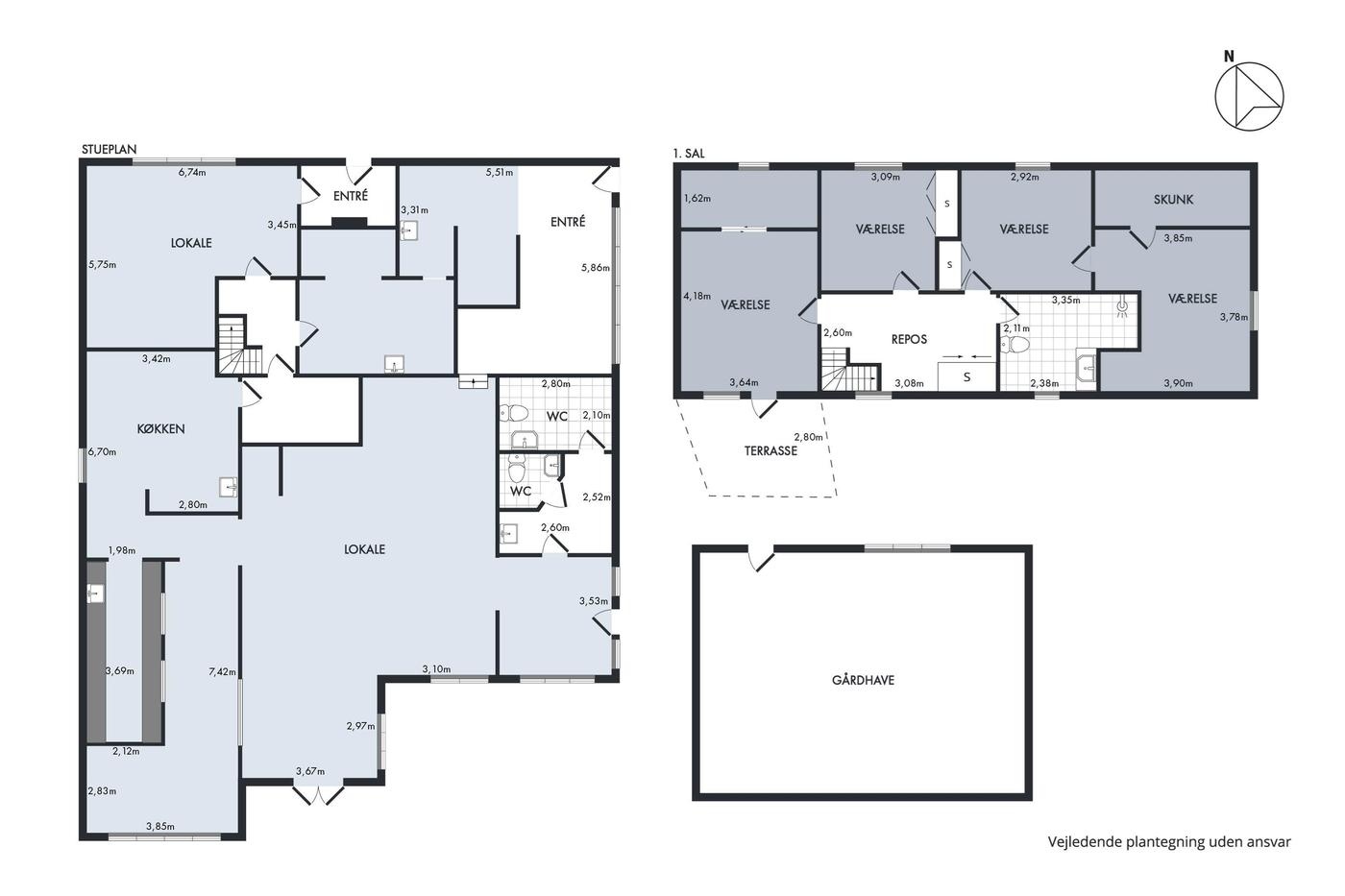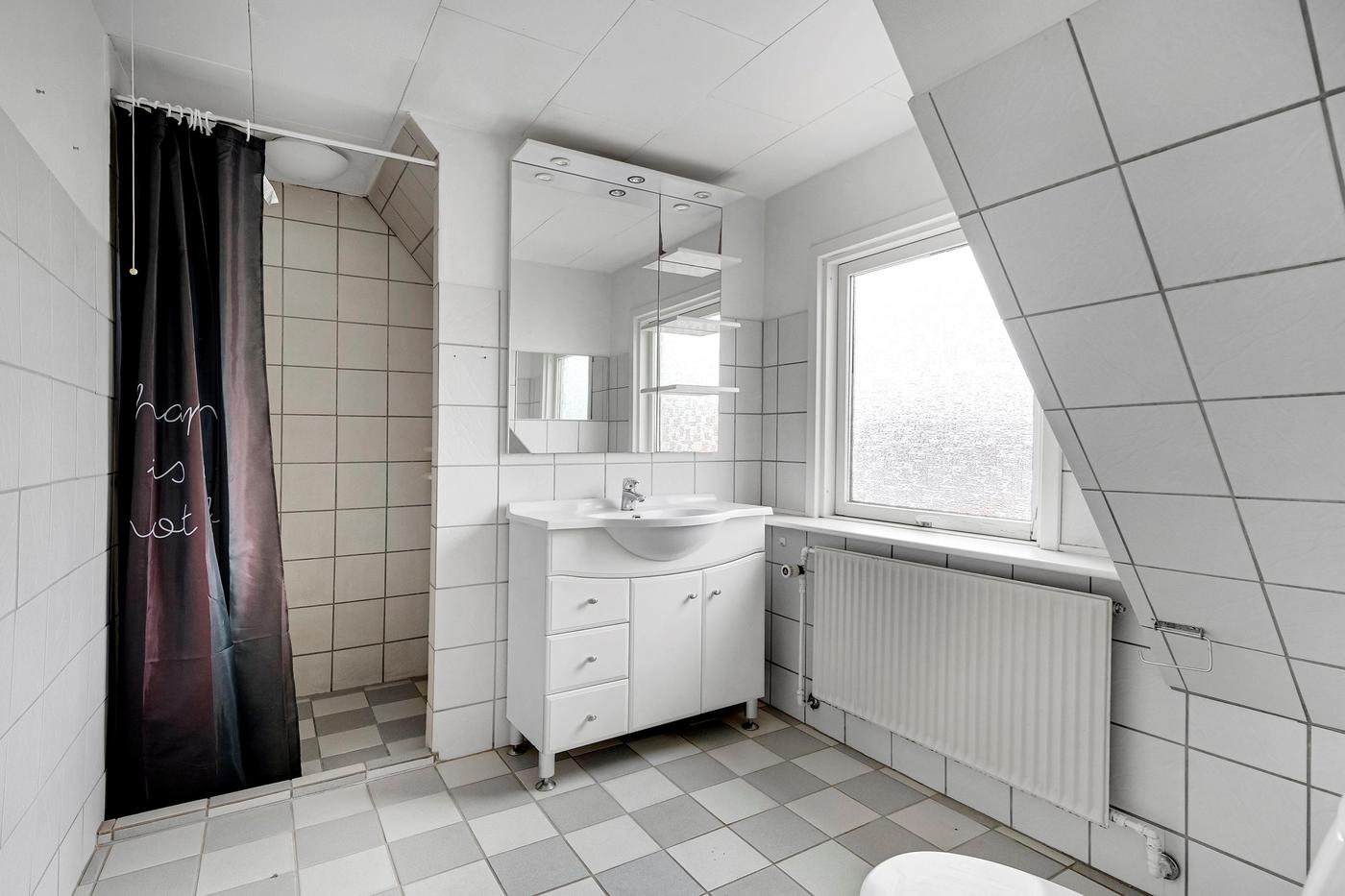 Boligdelen har klikgulve og gulvtæpper, og består af en stor stue, men der er ingen køkken i boligen. Der skal laves lidt om for at opdele erhvervs- og boligarealerne. Der er i alt 4 værelser, et repos og en skunk samt et toilet. Der er også en tagterrasse.