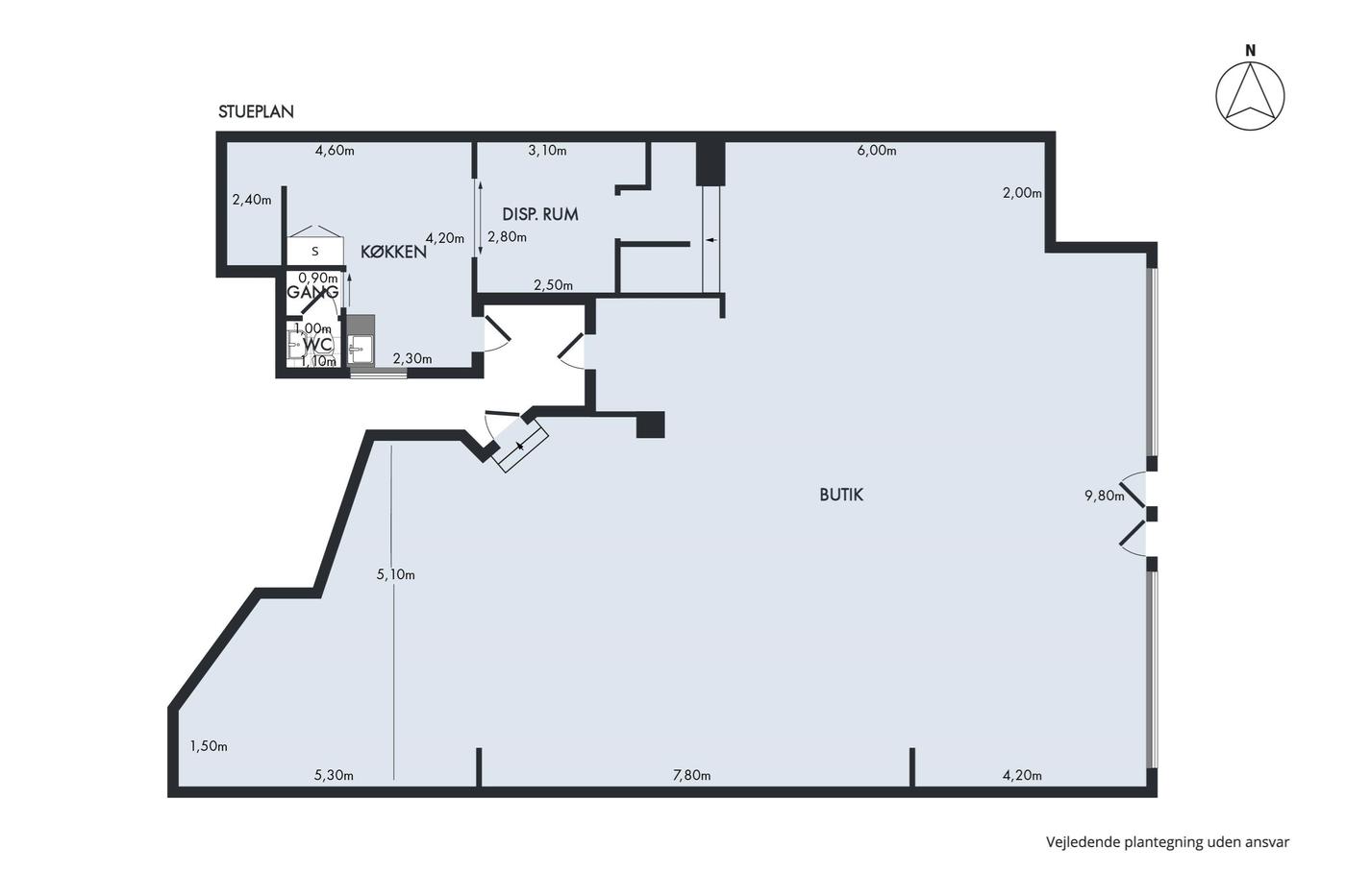 Lejemålet breder sig på i alt 211 m², fordelt med et regulært butikslokale og baglokale med adgang til toilet, kontor og the-køkken. Lokalet fremtræder præsentabelt med fast grundbelysning, vinyl- og flisegulve samt malede lofter og murværk. Der er to trin ned, men kan med fordel etableres niveaufri adgang, og der er i øvrigt mulighed for udstilling af gadevarer.