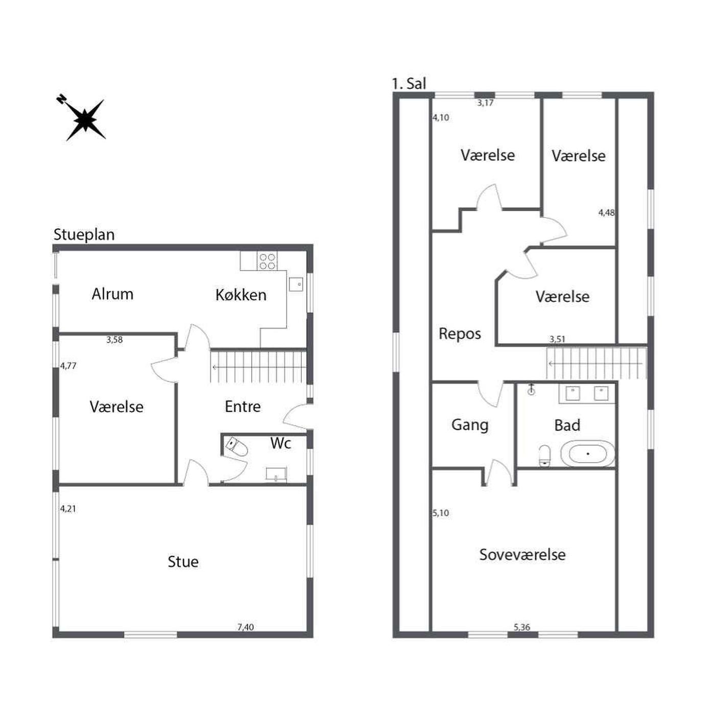 Boligen indeholder: Hall med trappe til overetagen - Opholdsstue - Spisestue - Køkken med spiseplads - Badeværelse. 1. sal er indrettet med følgende: Alrum - Disponibelt rum med direkte adgang til badeværelse - Badeværelse - 2 gode værelser - Soveværelse - Kammer. Fra underetagen er der udgang til flisebelagt terrasse og have.