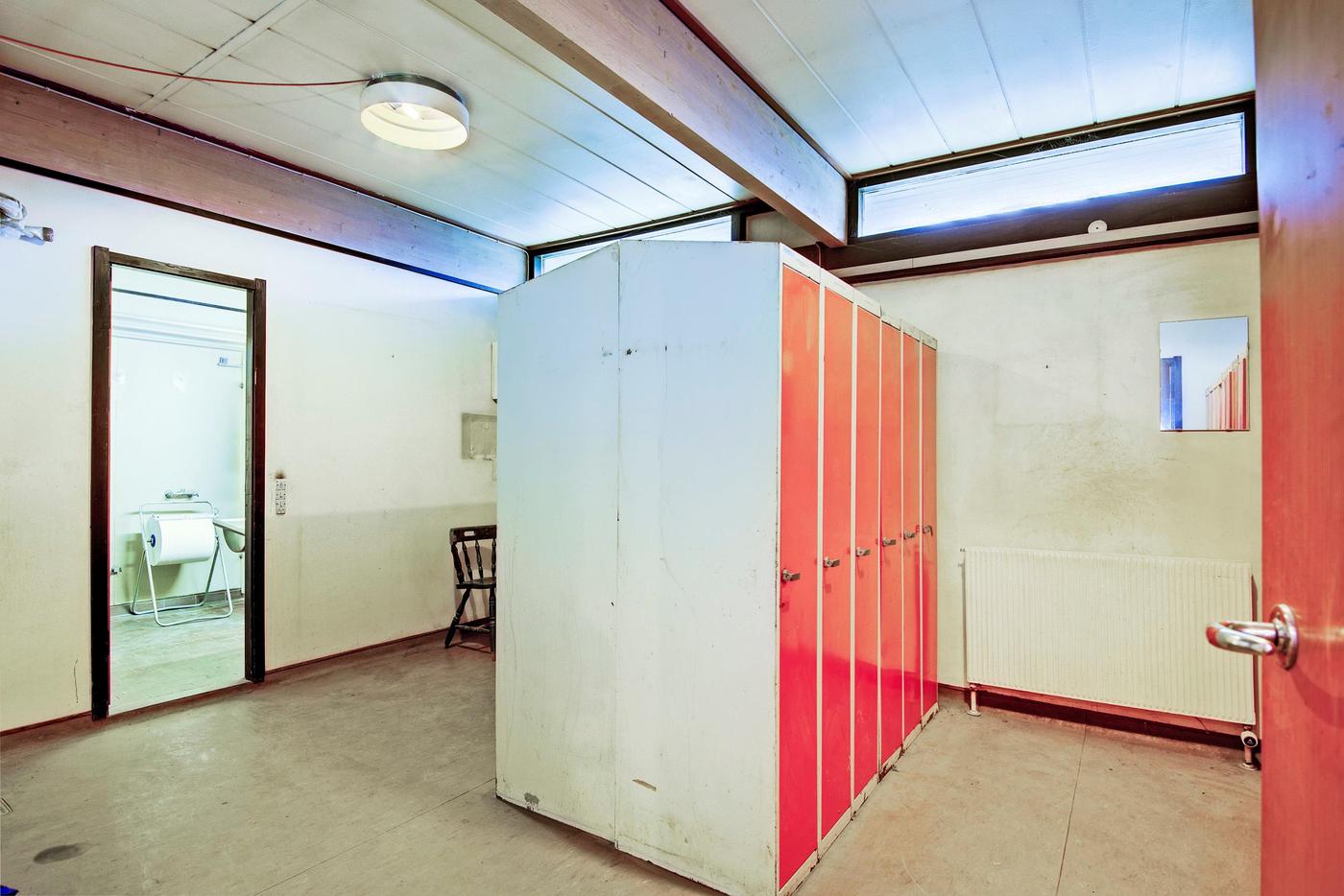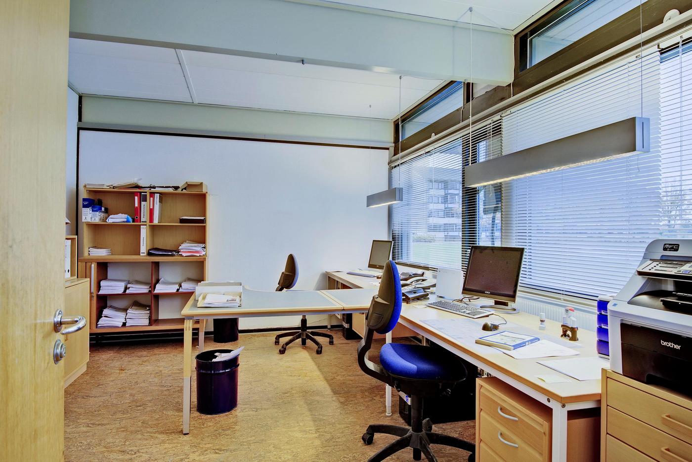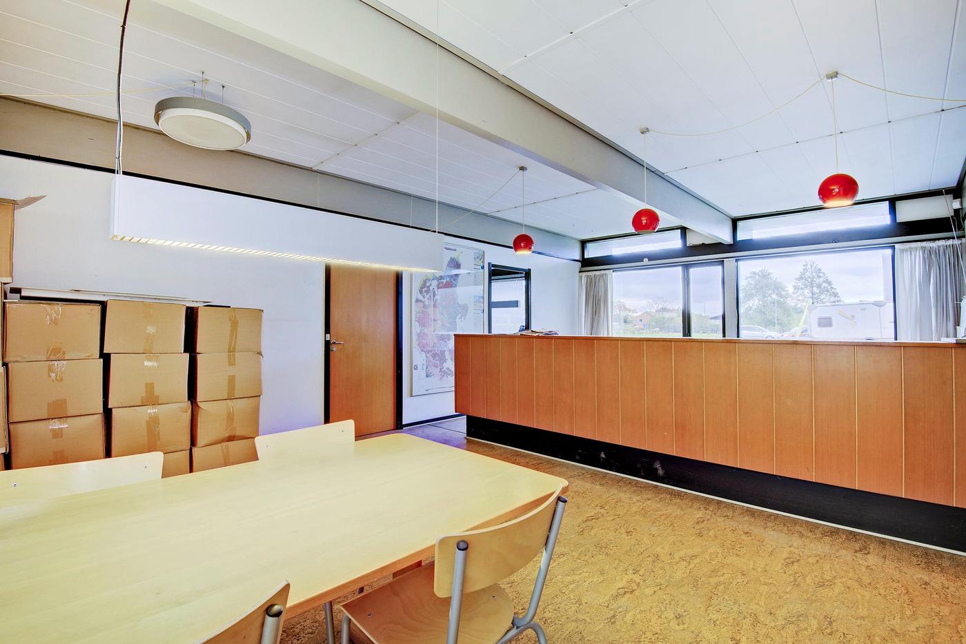 Administrationen er indrettet med følgende: Forkontor/ reception - 3 kontorer - Arkiv - Garderobe - Toilet - Gang - Køkken - 2 depotrum - Omklædning med brus og toilet - Opholdsrum/kantine - Toilet.