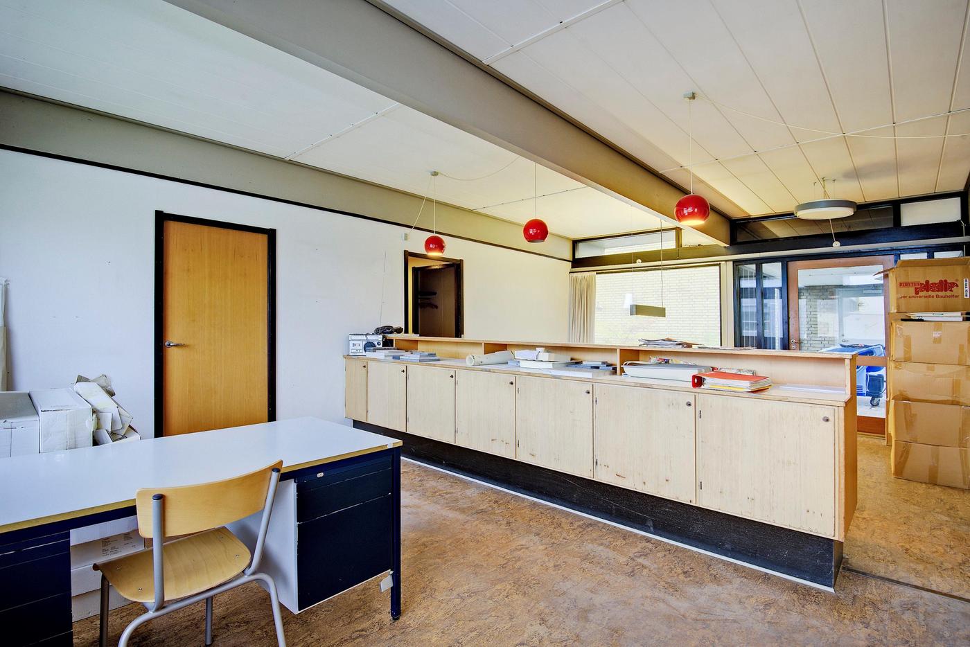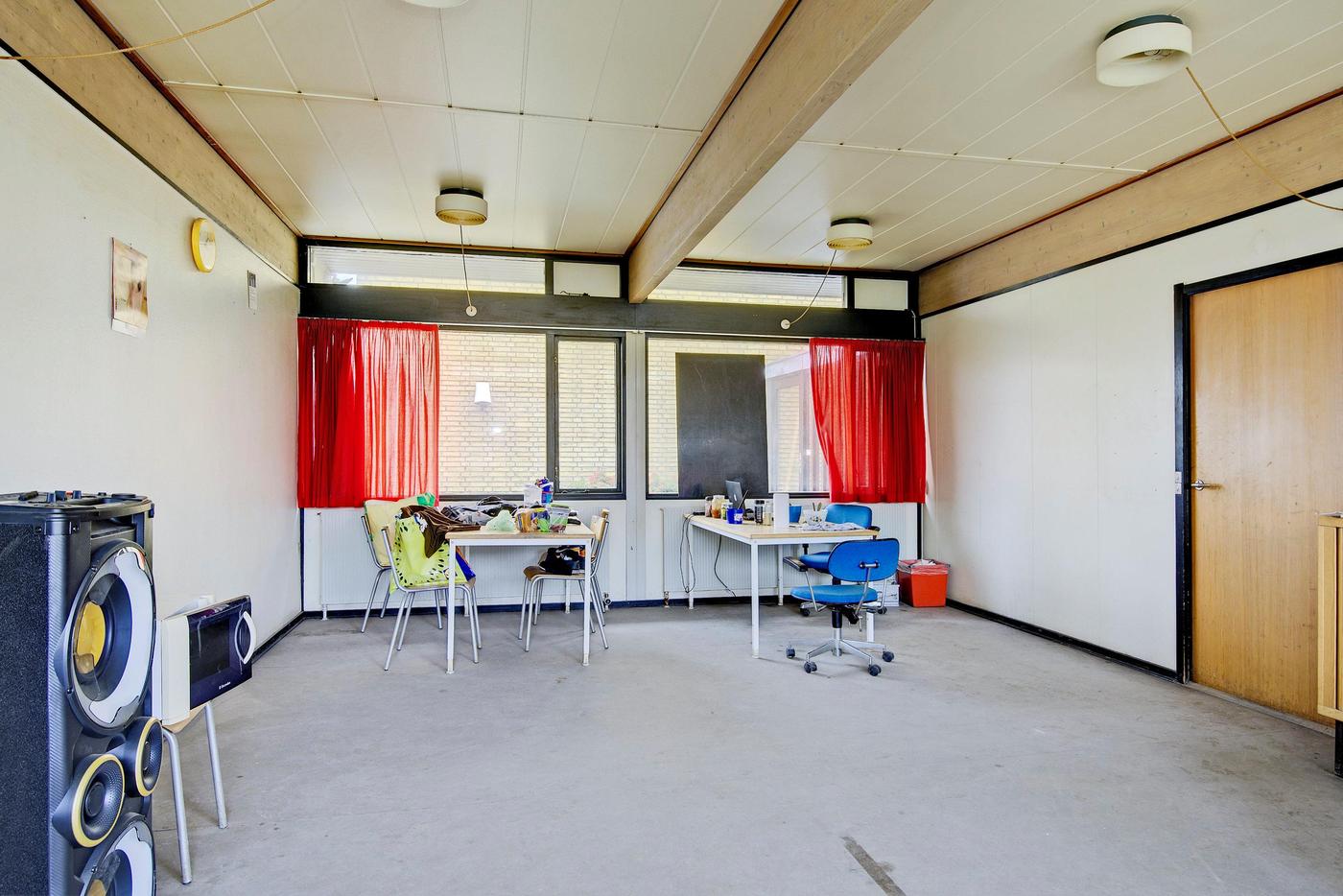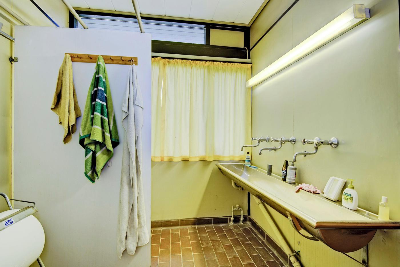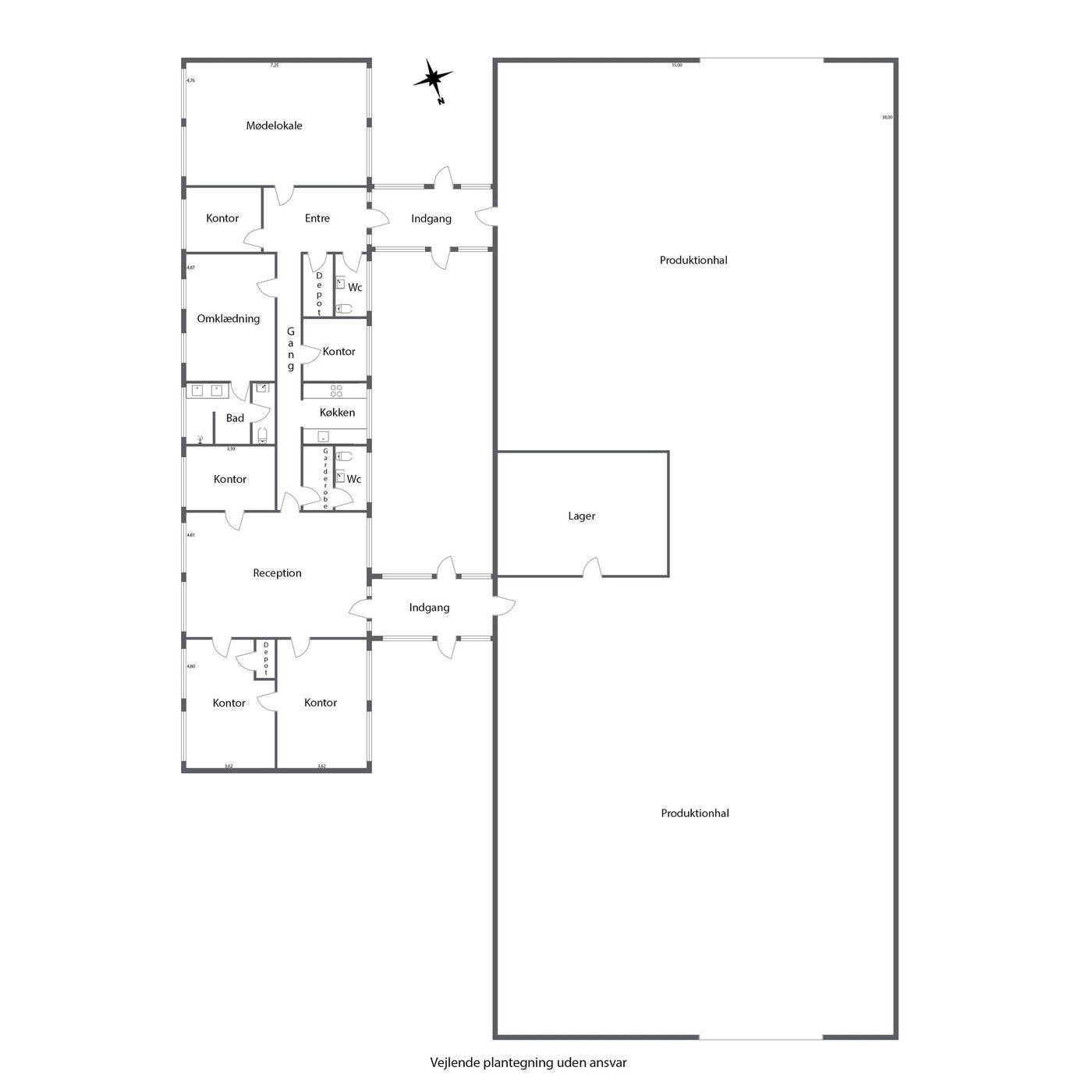 Administrationen er indrettet med følgende: Forkontor/ reception - 3 kontorer - Arkiv - Garderobe - Toilet - Gang - Køkken - 2 depotrum - Omklædning med brus og toilet - Opholdsrum/kantine - Toilet.