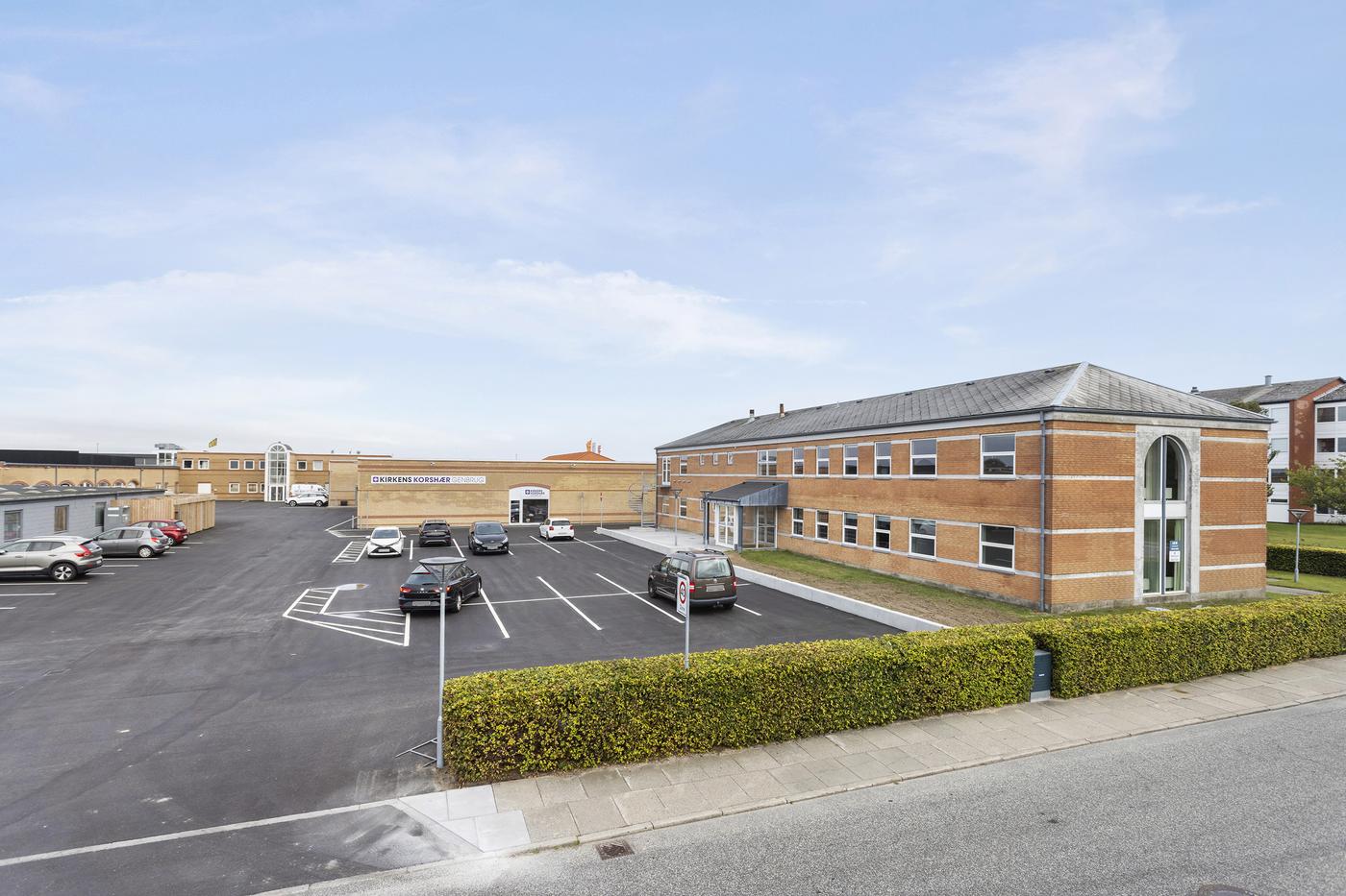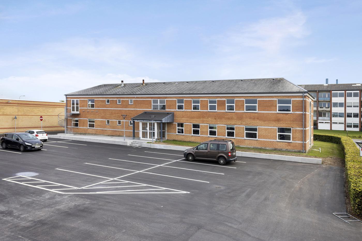 Der er kundeparkeringsplads foran ejendommen - og stor personale parkeringsplads og cykelskur på bagsiden af ejendommen.